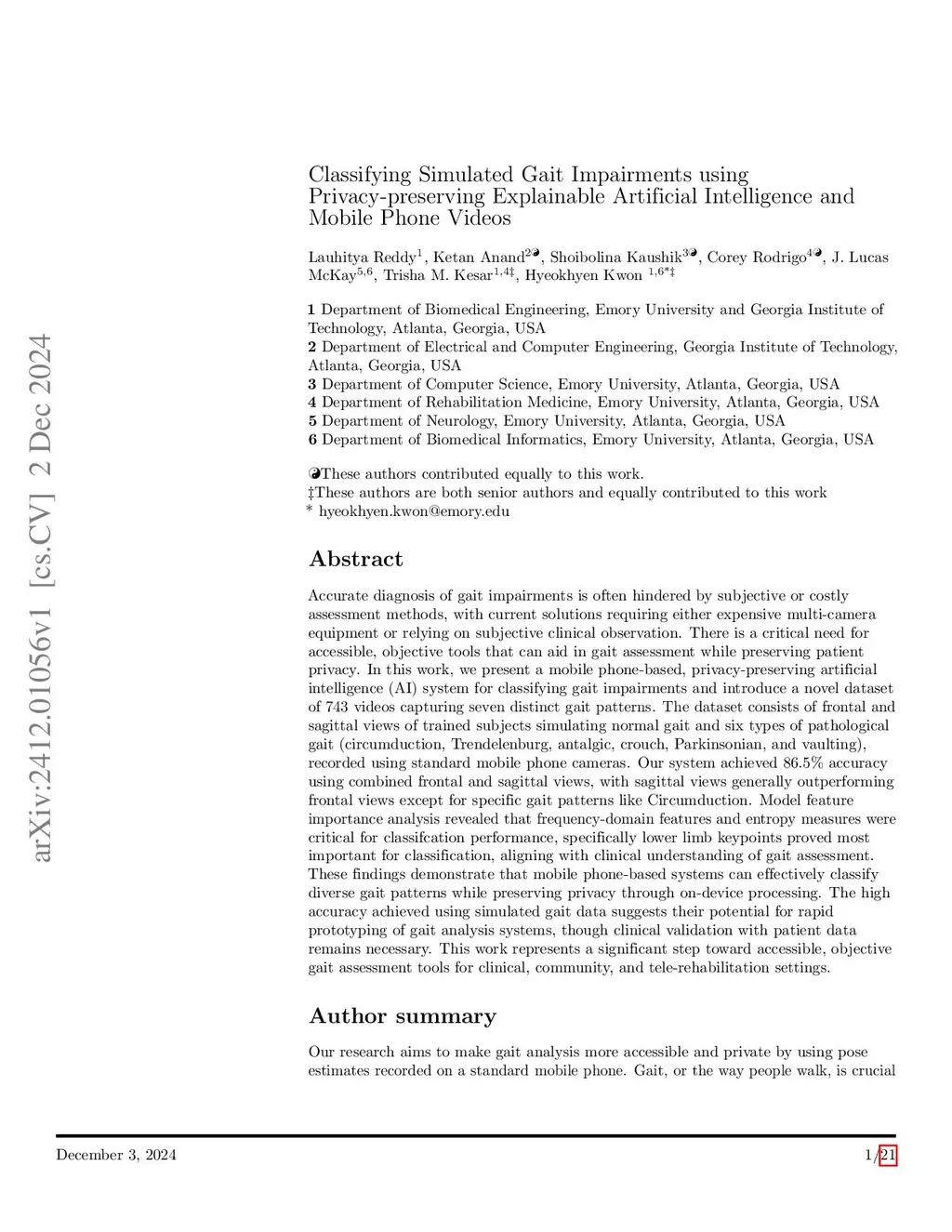 Accurate diagnosis of gait impairments is often hindered by subjective or costly assessment methods, with current solutions requiring either expensive multi-camera equipment or relying on subjective clinical observation. There is a critical need for accessible, objective tools that can aid in gait assessment while preserving patient privacy. In this work, we present a mobile phone-based, privacy-preserving artificial intelligence (AI) system for classifying gait impairments and introduce a novel dataset of 743 videos capturing seven distinct gait patterns. The dataset consists of frontal and sagittal views of trained subjects simulating normal gait and six types of pathological gait (circumduction, Trendelenburg, antalgic, crouch, Parkinsonian, and vaulting), recorded using standard mobile phone cameras. Our system achieved 86.5% accuracy using combined frontal and sagittal views, with sagittal views generally outperforming frontal views except for specific gait patterns like Circumduction. Model feature importance analysis revealed that frequency-domain features and entropy measures were critical for classifcation performance, specifically lower limb keypoints proved most important for classification, aligning with clinical understanding of gait assessment. These findings demonstrate that mobile phone-based systems can effectively classify diverse gait patterns while preserving privacy through on-device processing. The high accuracy achieved using simulated gait data suggests their potential for rapid prototyping of gait analysis systems, though clinical validation with patient data remains necessary. This work represents a significant step toward accessible, objective gait assessment tools for clinical, community, and tele-rehabilitation settings