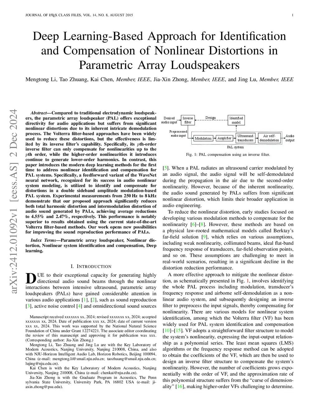 Compared to traditional electrodynamic loudspeakers, the parametric array loudspeaker (PAL) offers exceptional directivity for audio applications but suffers from significant nonlinear distortions due to its inherent intricate demodulation process. The Volterra filter-based approaches have been widely used to reduce these distortions, but the effectiveness is limited by its inverse filter's capability. Specifically, its pth-order inverse filter can only compensate for nonlinearities up to the pth order, while the higher-order nonlinearities it introduces continue to generate lower-order harmonics. In contrast, this paper introduces the modern deep learning methods for the first time to address nonlinear identification and compensation for PAL systems. Specifically, a feedforward variant of the WaveNet neural network, recognized for its success in audio nonlinear system modeling, is utilized to identify and compensate for distortions in a double sideband amplitude modulation-based PAL system. Experimental measurements from 250 Hz to 8 kHz demonstrate that our proposed approach significantly reduces both total harmonic distortion and intermodulation distortion of audio sound generated by PALs, achieving average reductions to 4.55% and 2.47%, respectively. This performance is notably superior to results obtained using the current state-of-the-art Volterra filter-based methods. Our work opens new possibilities for improving the sound reproduction performance of PALs.