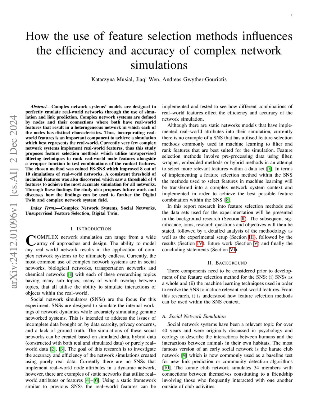 Complex network systems' models are designed to perfectly emulate real-world networks through the use of simulation and link prediction. Complex network systems are defined by nodes and their connections where both have real-world features that result in a heterogeneous network in which each of the nodes has distinct characteristics. Thus, incorporating real-world features is an important component to achieve a simulation which best represents the real-world. Currently very few complex network systems implement real-world features, thus this study proposes feature selection methods which utilise unsupervised filtering techniques to rank real-world node features alongside a wrapper function to test combinations of the ranked features. The chosen method was coined FS-SNS which improved 8 out of 10 simulations of real-world networks. A consistent threshold of included features was also discovered which saw a threshold of 4 features to achieve the most accurate simulation for all networks. Through these findings the study also proposes future work and discusses how the findings can be used to further the Digital Twin and complex network system field.