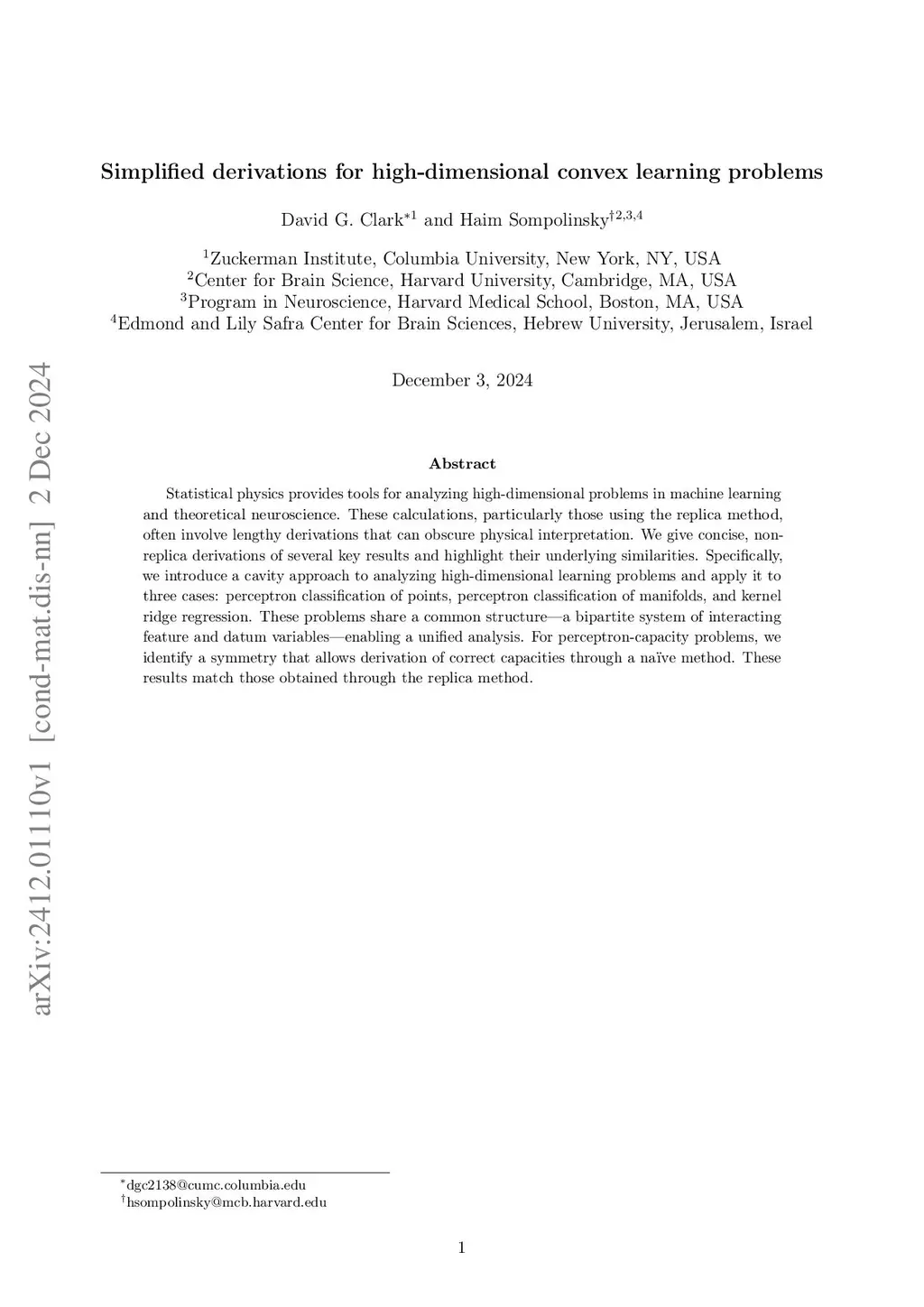 Statistical-physics calculations in machine learning and theoretical neuroscience often involve lengthy derivations that obscure physical interpretation. Here, we give concise, non-replica derivations of several key results and highlight their underlying similarities. In particular, using a cavity approach, we analyze three high-dimensional learning problems: perceptron classification of points, perceptron classification of manifolds, and kernel ridge regression. These problems share a common structure--a bipartite system of interacting feature and datum variables--enabling a unified analysis. Furthermore, for perceptron-capacity problems, we identify a symmetry that allows derivation of correct capacities through a naive method.
