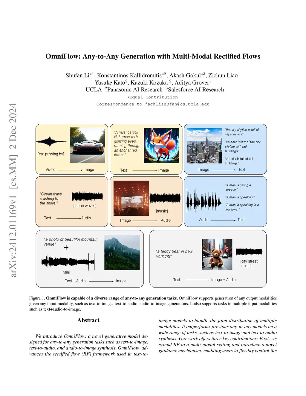 We introduce OmniFlow, a novel generative model designed for any-to-any generation tasks such as text-to-image, text-to-audio, and audio-to-image synthesis. OmniFlow advances the rectified flow (RF) framework used in text-to-image models to handle the joint distribution of multiple modalities. It outperforms previous any-to-any models on a wide range of tasks, such as text-to-image and text-to-audio synthesis. Our work offers three key contributions: First, we extend RF to a multi-modal setting and introduce a novel guidance mechanism, enabling users to flexibly control the alignment between different modalities in the generated outputs. Second, we propose a novel architecture that extends the text-to-image MMDiT architecture of Stable Diffusion 3 and enables audio and text generation. The extended modules can be efficiently pretrained individually and merged with the vanilla text-to-image MMDiT for fine-tuning. Lastly, we conduct a comprehensive study on the design choices of rectified flow transformers for large-scale audio and text generation, providing valuable insights into optimizing performance across diverse modalities. The Code will be available atthis https URL.