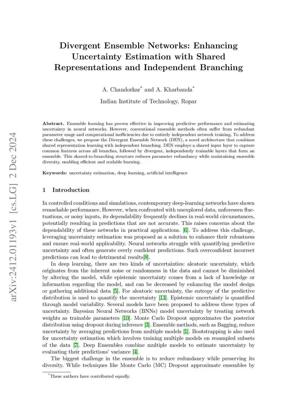 Ensemble learning has proven effective in improving predictive performance and estimating uncertainty in neural networks. However, conventional ensemble methods often suffer from redundant parameter usage and computational inefficiencies due to entirely independent network training. To address these challenges, we propose the Divergent Ensemble Network (DEN), a novel architecture that combines shared representation learning with independent branching. DEN employs a shared input layer to capture common features across all branches, followed by divergent, independently trainable layers that form an ensemble. This shared-to-branching structure reduces parameter redundancy while maintaining ensemble diversity, enabling efficient and scalable learning.
