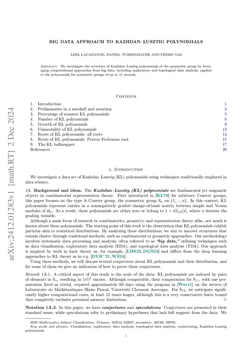 We investigate the structure of Kazhdan-Lusztig polynomials of the symmetric group by leveraging computational approaches from big data, including exploratory and topological data analysis, applied to the polynomials for symmetric groups of up to 11 strands.