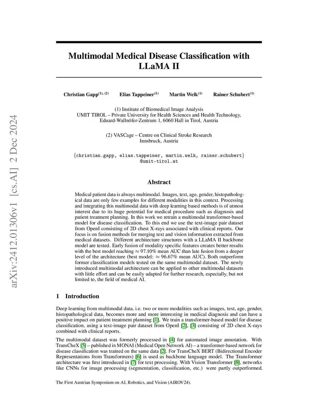 Medical patient data is always multimodal. Images, text, age, gender, histopathological data are only few examples for different modalities in this context. Processing and integrating this multimodal data with deep learning based methods is of utmost interest due to its huge potential for medical procedure such as diagnosis and patient treatment planning. In this work we retrain a multimodal transformer-based model for disease classification. To this end we use the text-image pair dataset from OpenI consisting of 2D chest X-rays associated with clinical reports. Our focus is on fusion methods for merging text and vision information extracted from medical datasets. Different architecture structures with a LLaMA II backbone model are tested. Early fusion of modality specific features creates better results with the best model reaching 97.10% mean AUC than late fusion from a deeper level of the architecture (best model: 96.67% mean AUC). Both outperform former classification models tested on the same multimodal dataset. The newly introduced multimodal architecture can be applied to other multimodal datasets with little effort and can be easily adapted for further research, especially, but not limited to, the field of medical AI.