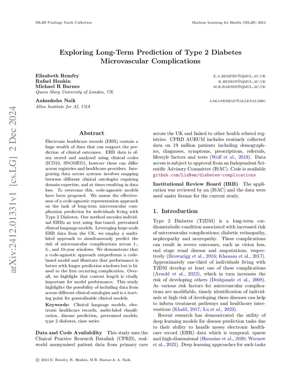 Electronic healthcare records (EHR) contain a huge wealth of data that can support the prediction of clinical outcomes. EHR data is often stored and analysed using clinical codes (ICD10, SNOMED), however these can differ across registries and healthcare providers. Integrating data across systems involves mapping between different clinical ontologies requiring domain expertise, and at times resulting in data loss. To overcome this, code-agnostic models have been proposed. We assess the effectiveness of a code-agnostic representation approach on the task of long-term microvascular complication prediction for individuals living with Type 2 Diabetes. Our method encodes individual EHRs as text using fine-tuned, pretrained clinical language models. Leveraging large-scale EHR data from the UK, we employ a multi-label approach to simultaneously predict the risk of microvascular complications across 1-, 5-, and 10-year windows. We demonstrate that a code-agnostic approach outperforms a code-based model and illustrate that performance is better with longer prediction windows but is biased to the first occurring complication. Overall, we highlight that context length is vitally important for model performance. This study highlights the possibility of including data from across different clinical ontologies and is a starting point for generalisable clinical models.