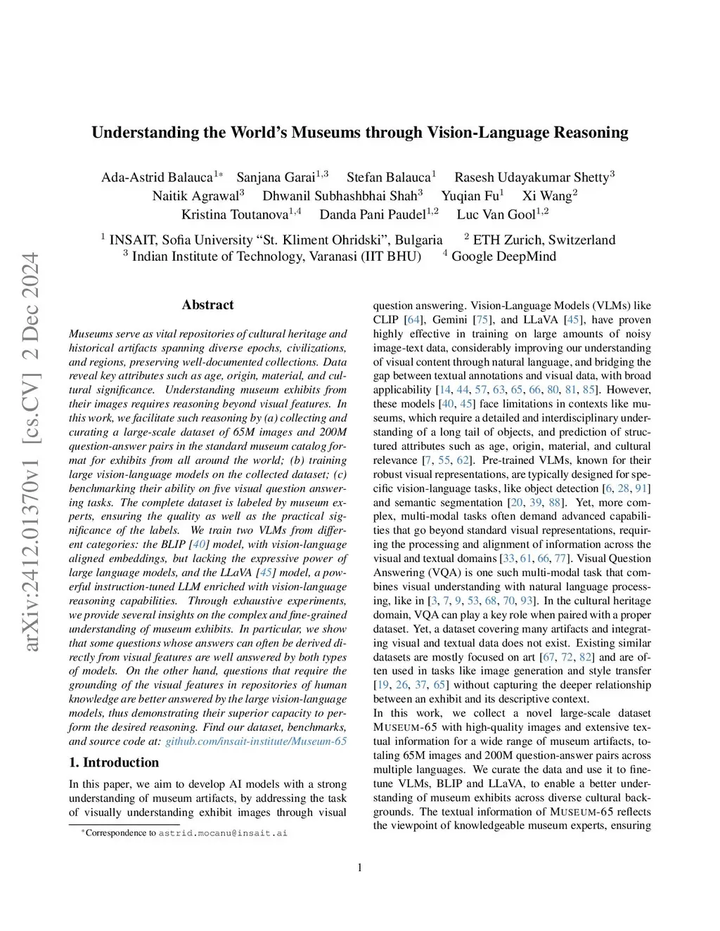 Museums serve as repositories of cultural heritage and historical artifacts from diverse epochs, civilizations, and regions, preserving well-documented collections that encapsulate vast knowledge, which, when systematically structured into large-scale datasets, can train specialized models. Visitors engage with exhibits through curiosity and questions, making expert domain-specific models essential for interactive query resolution and gaining historical insights. Understanding exhibits from images requires analyzing visual features and linking them to historical knowledge to derive meaningful correlations. We facilitate such reasoning by (a) collecting and curating a large-scale dataset of 65M images and 200M question-answer pairs for exhibits from all around the world; (b) training large vision-language models (VLMs) on the collected dataset; (c) benchmarking their ability on five visual question answering tasks, specifically designed to reflect real-world inquiries and challenges observed in museum settings. The complete dataset is labeled by museum experts, ensuring the quality and the practical significance of the labels. We train two VLMs from different categories: BLIP with vision-language aligned embeddings, but lacking the expressive power of large language models, and the LLaVA model, a powerful instruction-tuned LLM enriched with vision-language reasoning capabilities. Through extensive experiments, we find that while both model types effectively answer visually grounded questions, large vision-language models excel in queries requiring deeper historical context and reasoning. We further demonstrate the necessity of fine-tuning models on large-scale domain-specific datasets by showing that our fine-tuned models significantly outperform current SOTA VLMs in answering questions related to specific attributes, highlighting their limitations in handling complex, nuanced queries.