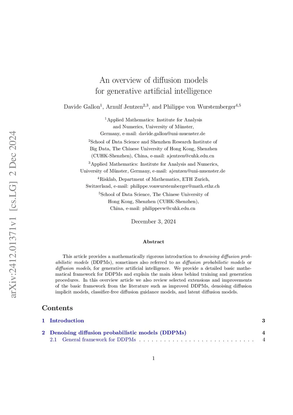 This article provides a mathematically rigorous introduction to denoising diffusion probabilistic models (DDPMs), sometimes also referred to as diffusion probabilistic models or diffusion models, for generative artificial intelligence. We provide a detailed basic mathematical framework for DDPMs and explain the main ideas behind training and generation procedures. In this overview article we also review selected extensions and improvements of the basic framework from the literature such as improved DDPMs, denoising diffusion implicit models, classifier-free diffusion guidance models, and latent diffusion models.