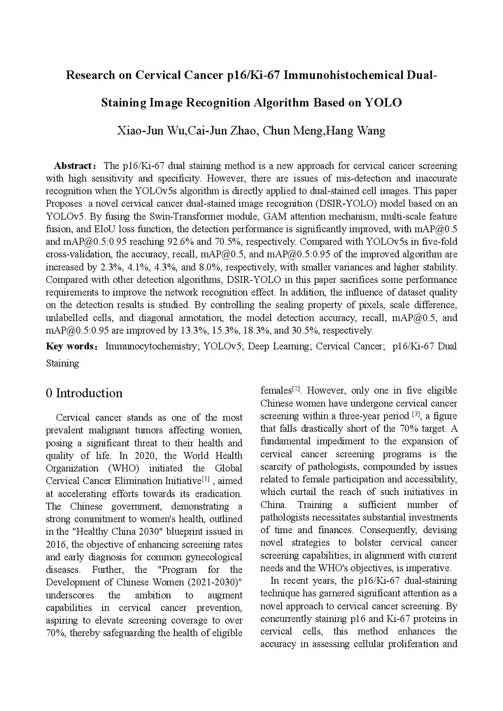 The p16/Ki-67 dual staining method is a new approach for cervical cancer screening with high sensitivity and specificity. However, there are issues of mis-detection and inaccurate recognition when the YOLOv5s algorithm is directly applied to dual-stained cell images. This paper Proposes a novel cervical cancer dual-stained image recognition (DSIR-YOLO) model based on an YOLOv5. By fusing the Swin-Transformer module, GAM attention mechanism, multi-scale feature fusion, and EIoU loss function, the detection performance is significantly improved, with mAP@0.5 and mAP@0.5:0.95 reaching 92.6% and 70.5%, respectively. Compared with YOLOv5s in five-fold cross-validation, the accuracy, recall, mAP@0.5, and mAP@0.5:0.95 of the improved algorithm are increased by 2.3%, 4.1%, 4.3%, and 8.0%, respectively, with smaller variances and higher stability. Compared with other detection algorithms, DSIR-YOLO in this paper sacrifices some performance requirements to improve the network recognition effect. In addition, the influence of dataset quality on the detection results is studied. By controlling the sealing property of pixels, scale difference, unlabelled cells, and diagonal annotation, the model detection accuracy, recall, mAP@0.5, and mAP@0.5:0.95 are improved by 13.3%, 15.3%, 18.3%, and 30.5%, respectively.