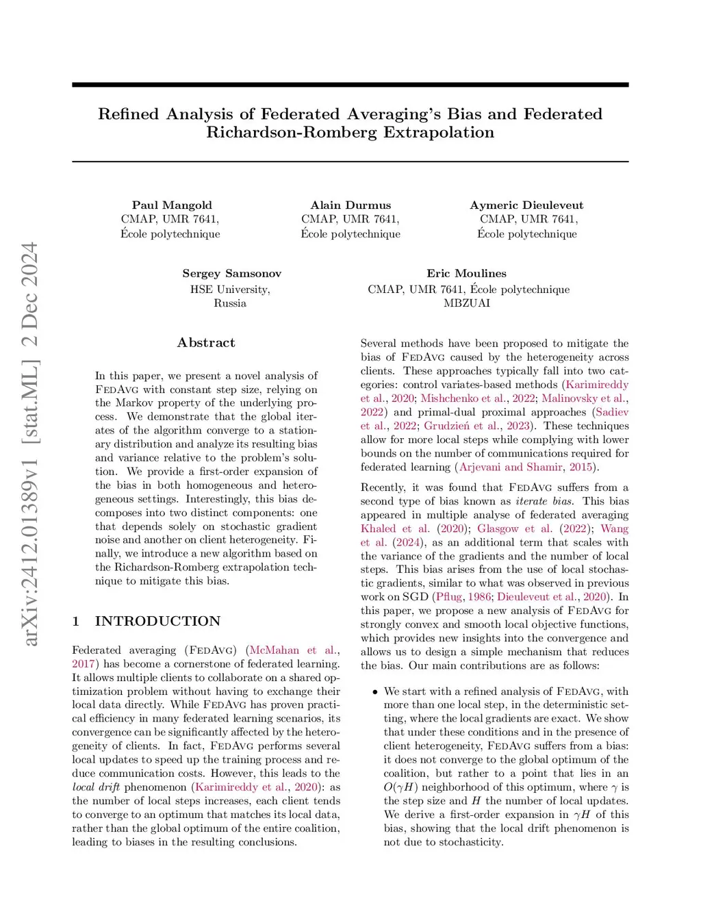 In this paper, we present a novel analysis of \FedAvg with constant step size, relying on the Markov property of the underlying process. We demonstrate that the global iterates of the algorithm converge to a stationary distribution and analyze its resulting bias and variance relative to the problem's solution. We provide a first-order bias expansion in both homogeneous and heterogeneous settings. Interestingly, this bias decomposes into two distinct components: one that depends solely on stochastic gradient noise and another on client heterogeneity. Finally, we introduce a new algorithm based on the Richardson-Romberg extrapolation technique to mitigate this bias.