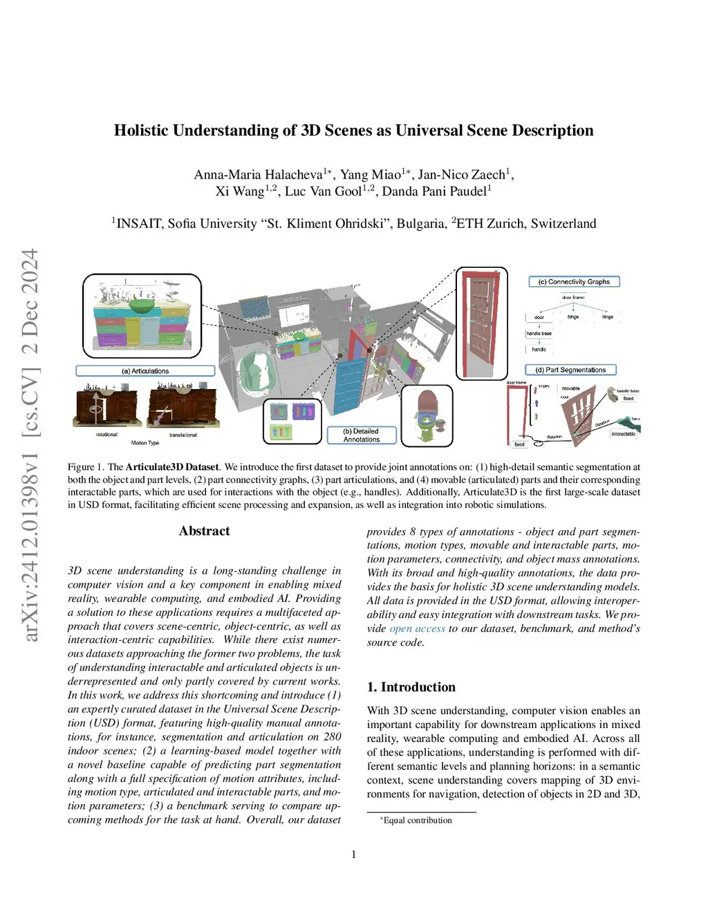 3D scene understanding is a long-standing challenge in computer vision and a key component in enabling mixed reality, wearable computing, and embodied AI. Providing a solution to these applications requires a multifaceted approach that covers scene-centric, object-centric, as well as interaction-centric capabilities. While there exist numerous datasets and algorithms approaching the former two problems, the task of understanding interactable and articulated objects is underrepresented and only partly covered in the research field. In this work, we address this shortcoming by introducing: (1) Articulate3D, an expertly curated 3D dataset featuring high-quality manual annotations on 280 indoor scenes. Articulate3D provides 8 types of annotations for articulated objects, covering parts and detailed motion information, all stored in a standardized scene representation format designed for scalable 3D content creation, exchange and seamless integration into simulation environments. (2) USDNet, a novel unified framework capable of simultaneously predicting part segmentation along with a full specification of motion attributes for articulated objects. We evaluate USDNet on Articulate3D as well as two existing datasets, demonstrating the advantage of our unified dense prediction approach. Furthermore, we highlight the value of Articulate3D through cross-dataset and cross-domain evaluations and showcase its applicability in downstream tasks such as scene editing through LLM prompting and robotic policy training for articulated object manipulation. We provide open access to our dataset, benchmark, and method's source code.