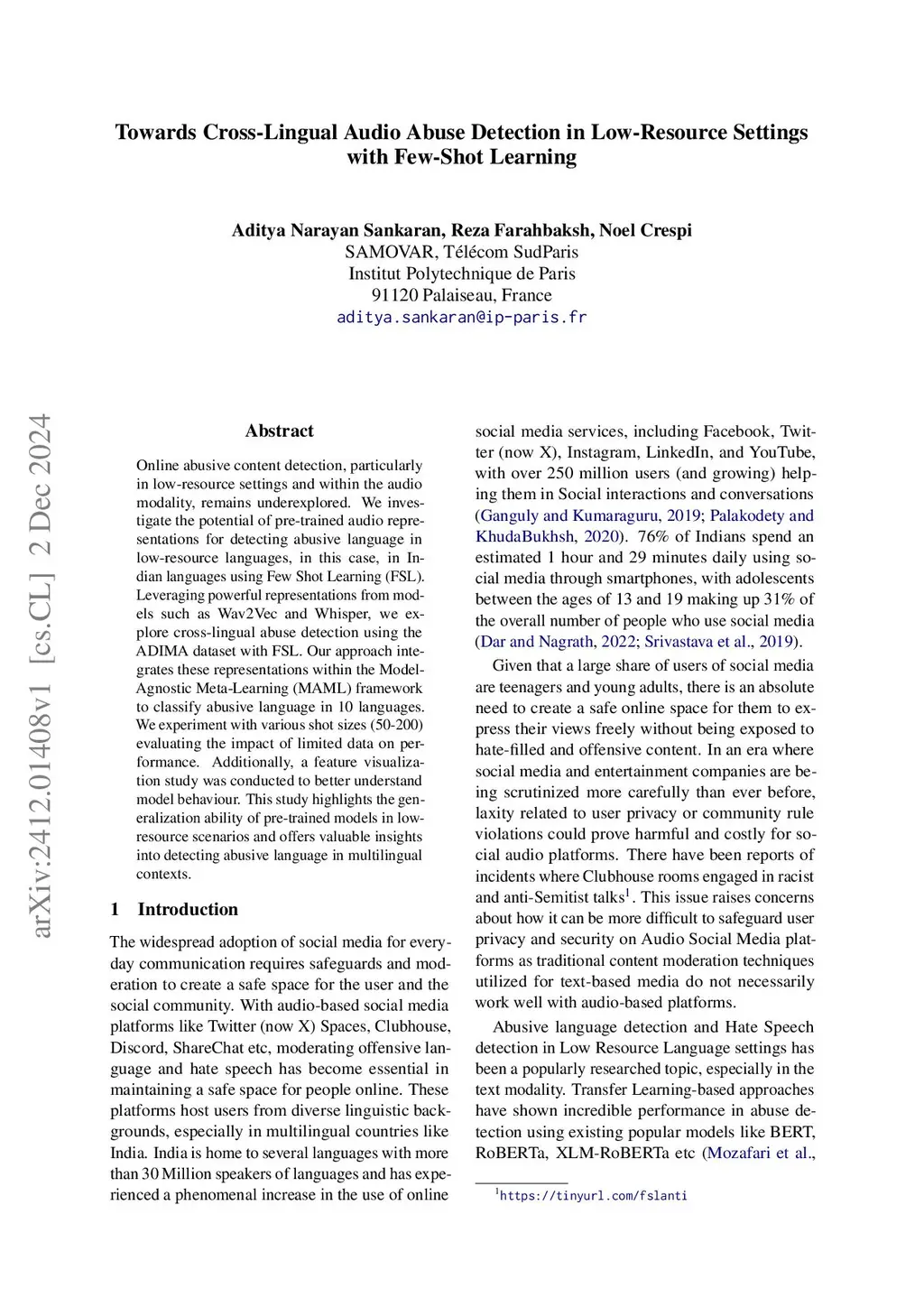 Online abusive content detection, particularly in low-resource settings and within the audio modality, remains underexplored. We investigate the potential of pre-trained audio representations for detecting abusive language in low-resource languages, in this case, in Indian languages using Few Shot Learning (FSL). Leveraging powerful representations from models such as Wav2Vec and Whisper, we explore cross-lingual abuse detection using the ADIMA dataset with FSL. Our approach integrates these representations within the Model-Agnostic Meta-Learning (MAML) framework to classify abusive language in 10 languages. We experiment with various shot sizes (50-200) evaluating the impact of limited data on performance. Additionally, a feature visualization study was conducted to better understand model behaviour. This study highlights the generalization ability of pre-trained models in low-resource scenarios and offers valuable insights into detecting abusive language in multilingual contexts.