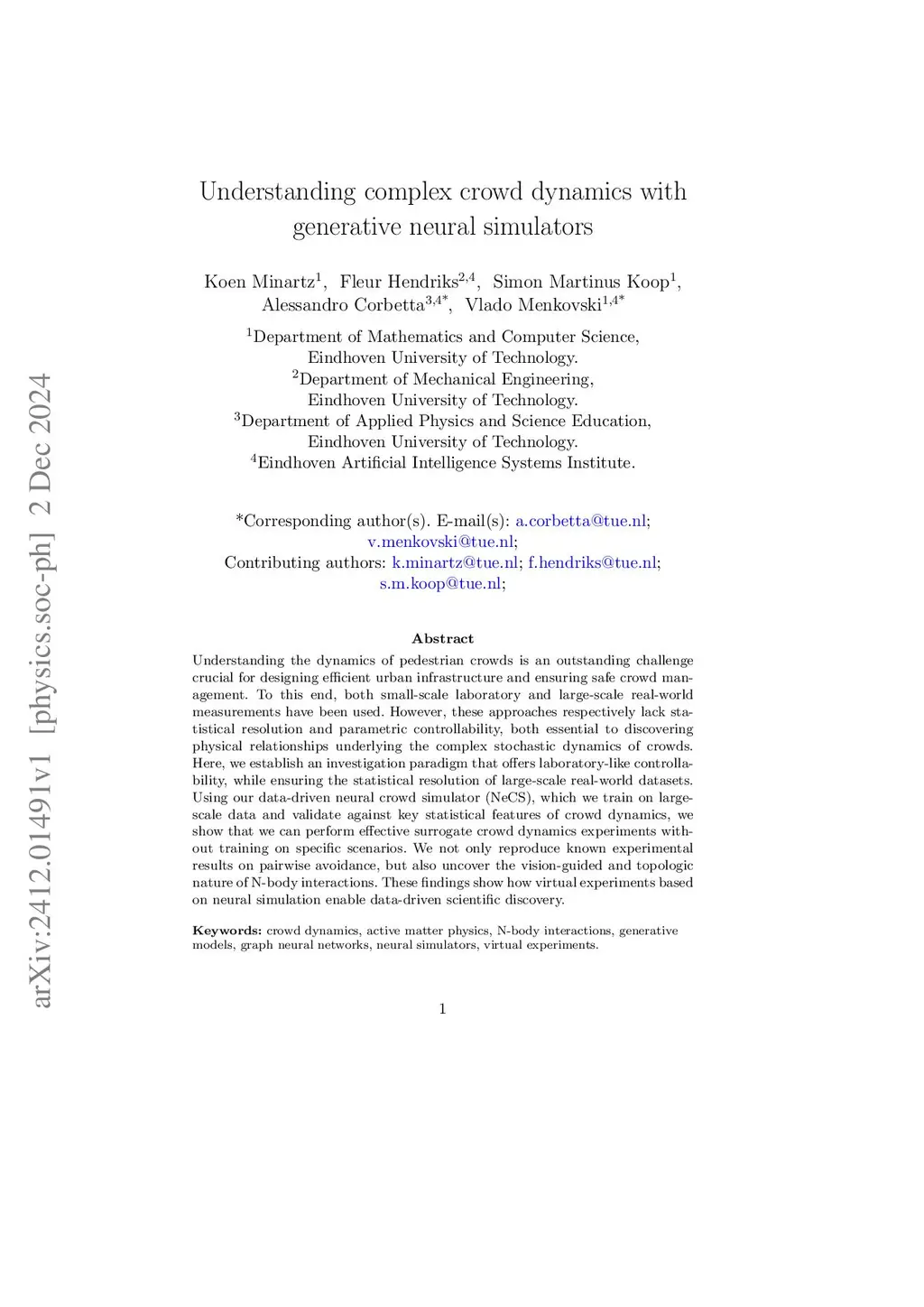 Understanding the dynamics of pedestrian crowds is an outstanding challenge crucial for designing efficient urban infrastructure and ensuring safe crowd management. To this end, both small-scale laboratory and large-scale real-world measurements have been used. However, these approaches respectively lack statistical resolution and parametric controllability, both essential to discovering physical relationships underlying the complex stochastic dynamics of crowds. Here, we establish an investigation paradigm that offers laboratory-like controllability, while ensuring the statistical resolution of large-scale real-world datasets. Using our data-driven Neural Crowd Simulator (NeCS), which we train on large-scale data and validate against key statistical features of crowd dynamics, we show that we can perform effective surrogate crowd dynamics experiments without training on specific scenarios. We not only reproduce known experimental results on pairwise avoidance, but also uncover the vision-guided and topological nature of N-body interactions. These findings show how virtual experiments based on neural simulation enable data-driven scientific discovery.
