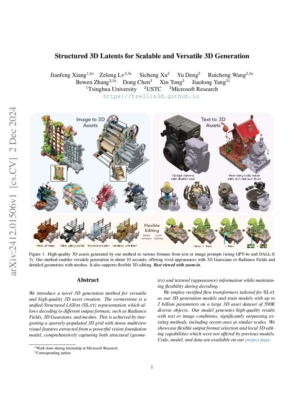 We introduce a novel 3D generation method for versatile and high-quality 3D asset creation. The cornerstone is a unified Structured LATent (SLAT) representation which allows decoding to different output formats, such as Radiance Fields, 3D Gaussians, and meshes. This is achieved by integrating a sparsely-populated 3D grid with dense multiview visual features extracted from a powerful vision foundation model, comprehensively capturing both structural (geometry) and textural (appearance) information while maintaining flexibility during decoding. We employ rectified flow transformers tailored for SLAT as our 3D generation models and train models with up to 2 billion parameters on a large 3D asset dataset of 500K diverse objects. Our model generates high-quality results with text or image conditions, significantly surpassing existing methods, including recent ones at similar scales. We showcase flexible output format selection and local 3D editing capabilities which were not offered by previous models. Code, model, and data will be released.