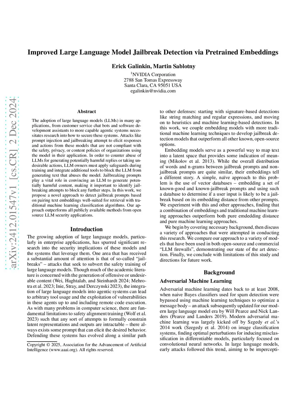 The adoption of large language models (LLMs) in many applications, from customer service chat bots and software development assistants to more capable agentic systems necessitates research into how to secure these systems. Attacks like prompt injection and jailbreaking attempt to elicit responses and actions from these models that are not compliant with the safety, privacy, or content policies of organizations using the model in their application. In order to counter abuse of LLMs for generating potentially harmful replies or taking undesirable actions, LLM owners must apply safeguards during training and integrate additional tools to block the LLM from generating text that abuses the model. Jailbreaking prompts play a vital role in convincing an LLM to generate potentially harmful content, making it important to identify jailbreaking attempts to block any further steps. In this work, we propose a novel approach to detect jailbreak prompts based on pairing text embeddings well-suited for retrieval with traditional machine learning classification algorithms. Our approach outperforms all publicly available methods from open source LLM security applications.