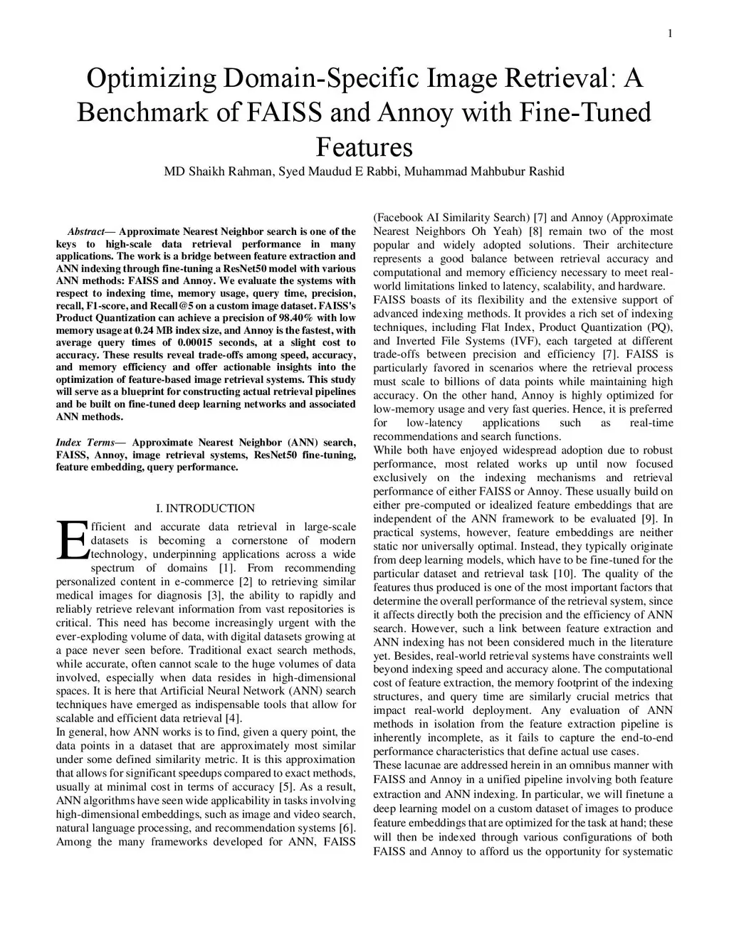 Approximate Nearest Neighbor search is one of the keys to high-scale data retrieval performance in many applications. The work is a bridge between feature extraction and ANN indexing through fine-tuning a ResNet50 model with various ANN methods: FAISS and Annoy. We evaluate the systems with respect to indexing time, memory usage, query time, precision, recall, F1-score, and Recall@5 on a custom image dataset. FAISS's Product Quantization can achieve a precision of 98.40% with low memory usage at 0.24 MB index size, and Annoy is the fastest, with average query times of 0.00015 seconds, at a slight cost to accuracy. These results reveal trade-offs among speed, accuracy, and memory efficiency and offer actionable insights into the optimization of feature-based image retrieval systems. This study will serve as a blueprint for constructing actual retrieval pipelines and be built on fine-tuned deep learning networks and associated ANN methods.