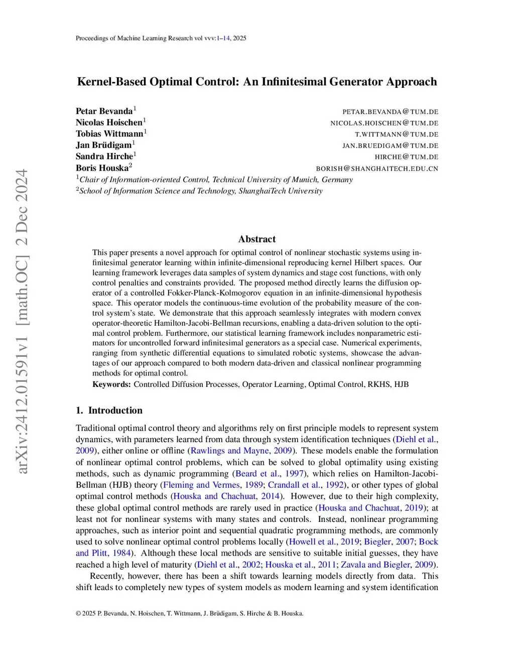This paper presents a novel operator-theoretic approach for optimal control of nonlinear stochastic systems within reproducing kernel Hilbert spaces. Our learning framework leverages data samples of system dynamics and stage cost functions, with only control penalties and constraints provided. The proposed method directly learns the infinitesimal generator of a controlled stochastic diffusion in an infinite-dimensional hypothesis space. We demonstrate that our approach seamlessly integrates with modern convex operator-theoretic Hamilton-Jacobi-Bellman recursions, enabling a data-driven solution to the optimal control problems. Furthermore, our learning framework includes nonparametric estimators for uncontrolled infinitesimal generators as a special case. Numerical experiments, ranging from synthetic differential equations to simulated robotic systems, showcase the advantages of our approach compared to both modern data-driven and classical nonlinear programming methods for optimal control.