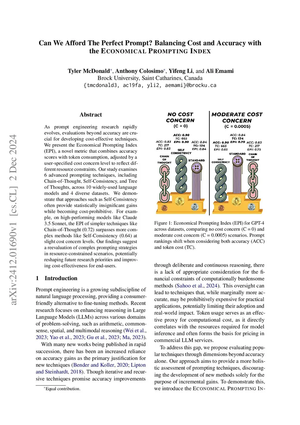As prompt engineering research rapidly evolves, evaluations beyond accuracy are crucial for developing cost-effective techniques. We present the Economical Prompting Index (EPI), a novel metric that combines accuracy scores with token consumption, adjusted by a user-specified cost concern level to reflect different resource constraints. Our study examines 6 advanced prompting techniques, including Chain-of-Thought, Self-Consistency, and Tree of Thoughts, across 10 widely-used language models and 4 diverse datasets. We demonstrate that approaches such as Self-Consistency often provide statistically insignificant gains while becoming cost-prohibitive. For example, on high-performing models like Claude 3.5 Sonnet, the EPI of simpler techniques like Chain-of-Thought (0.72) surpasses more complex methods like Self-Consistency (0.64) at slight cost concern levels. Our findings suggest a reevaluation of complex prompting strategies in resource-constrained scenarios, potentially reshaping future research priorities and improving cost-effectiveness for end-users.