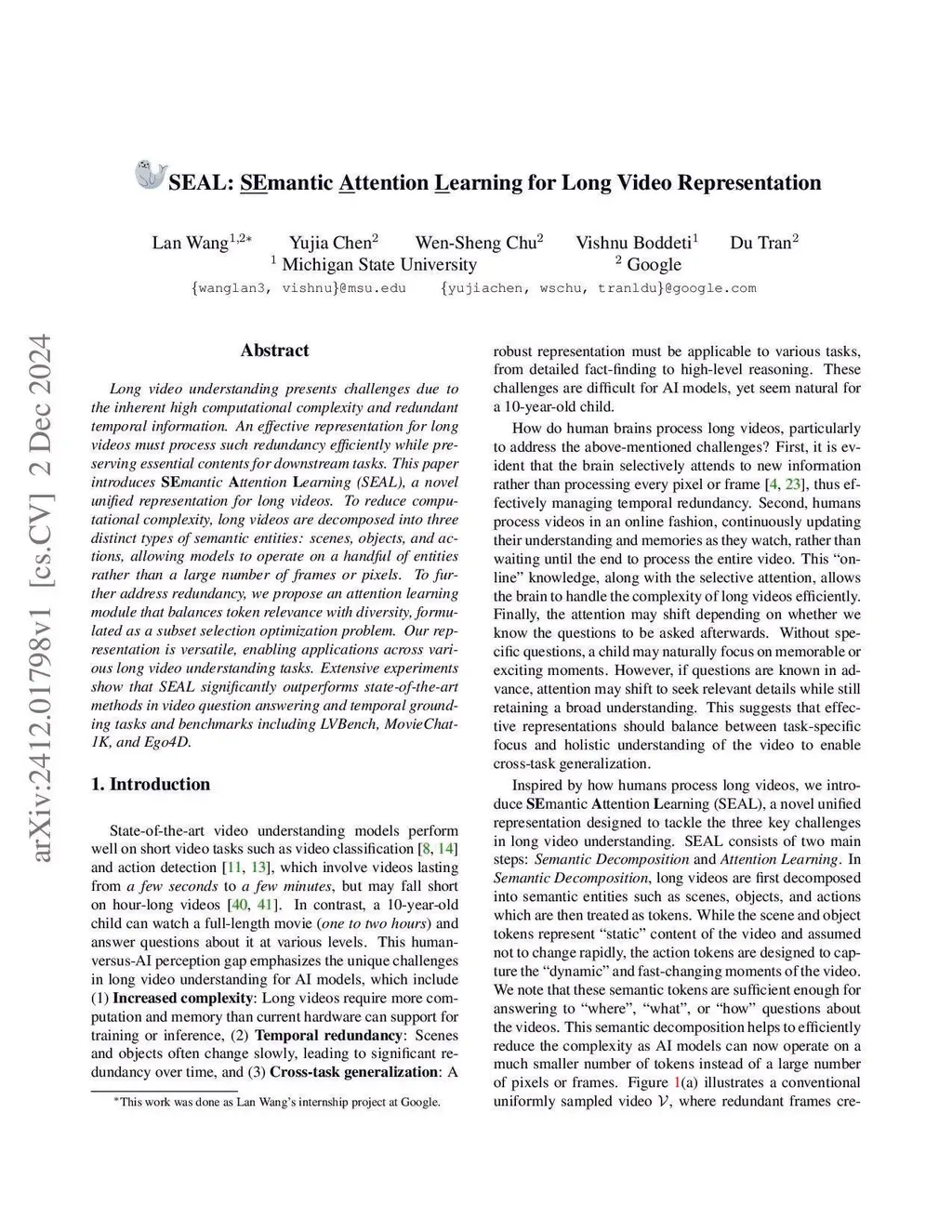 Long video understanding presents challenges due to the inherent high computational complexity and redundant temporal information. An effective representation for long videos must efficiently process such redundancy while preserving essential contents for downstream tasks. This paper introduces SEmantic Attention Learning (SEAL), a novel unified representation for long videos. To reduce computational complexity, long videos are decomposed into three distinct types of semantic entities: scenes, objects, and actions, allowing models to operate on a compact set of entities rather than a large number of frames or pixels. To further address redundancy, we propose an attention learning module that balances token relevance with diversity, formulated as a subset selection optimization problem. Our representation is versatile and applicable across various long video understanding tasks. Extensive experiments demonstrate that SEAL significantly outperforms state-of-the-art methods in video question answering and temporal grounding tasks across diverse benchmarks, including LVBench, MovieChat-1K, and Ego4D.