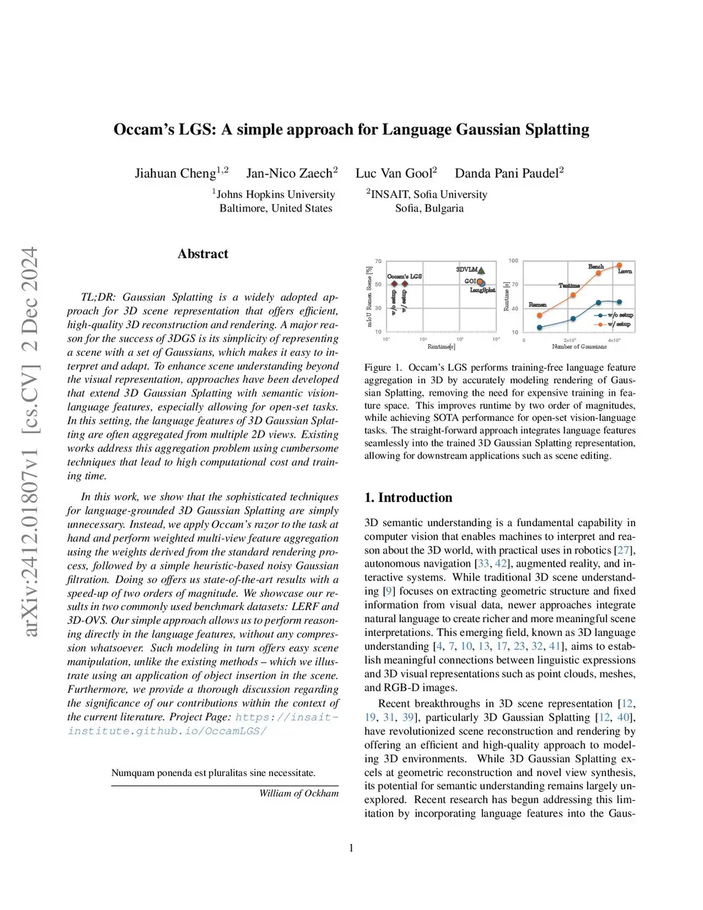 TL;DR: Gaussian Splatting is a widely adopted approach for 3D scene representation, offering efficient, high-quality reconstruction and rendering. A key reason for its success is the simplicity of representing scenes with sets of Gaussians, making it interpretable and adaptable. To enhance understanding beyond visual representation, recent approaches extend Gaussian Splatting with semantic vision-language features, enabling open-set tasks. Typically, these language features are aggregated from multiple 2D views, however, existing methods rely on cumbersome techniques, resulting in high computational costs and longer training times.In this work, we show that the complicated pipelines for language 3D Gaussian Splatting are simply unnecessary. Instead, we follow a probabilistic formulation of Language Gaussian Splatting and apply Occam's razor to the task at hand, leading to a highly efficient weighted multi-view feature aggregation technique. Doing so offers us state-of-the-art results with a speed-up of two orders of magnitude without any compression, allowing for easy scene manipulation. Project Page:this https URL