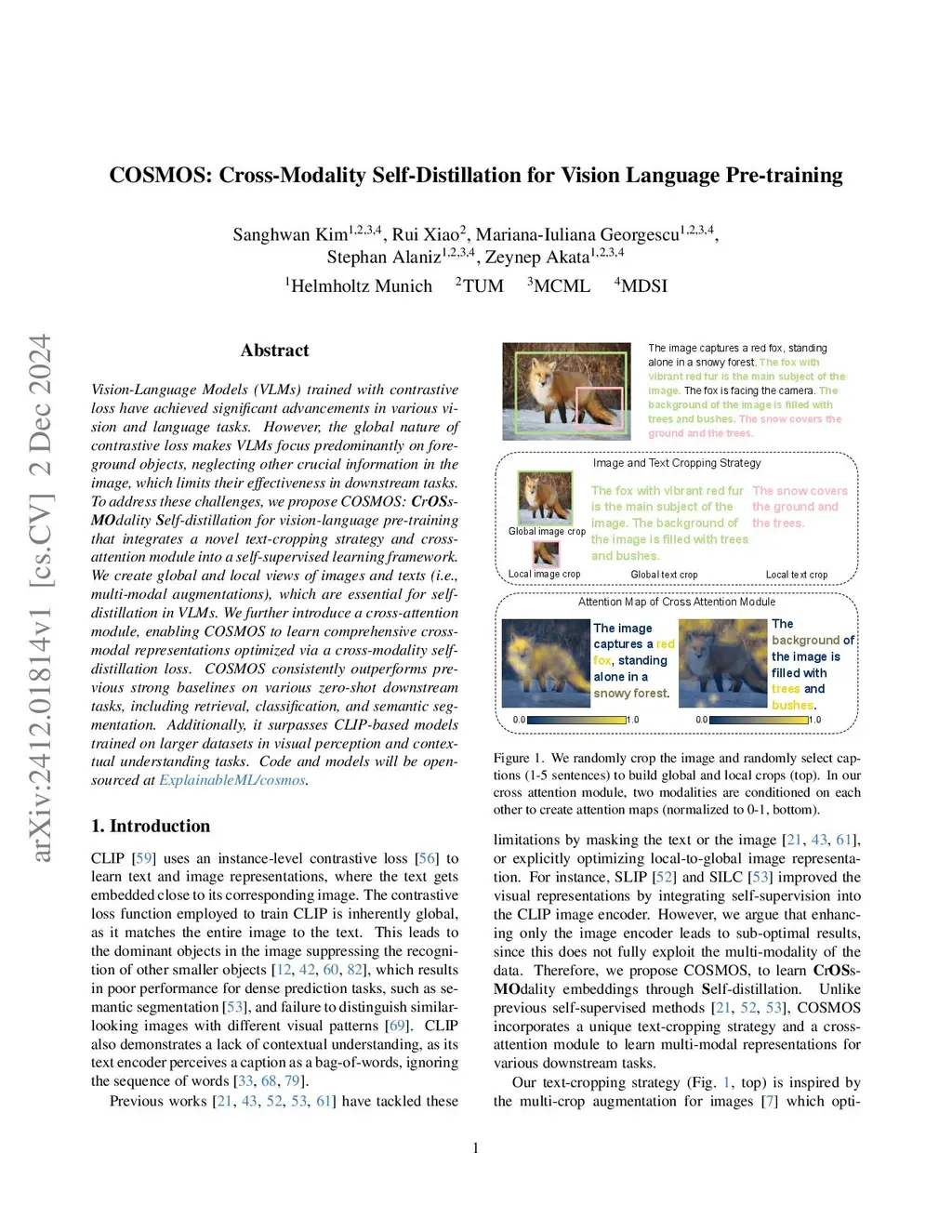 Vision-Language Models (VLMs) trained with contrastive loss have achieved significant advancements in various vision and language tasks. However, the global nature of the contrastive loss makes VLMs focus predominantly on foreground objects, neglecting other crucial information in the image, which limits their effectiveness in downstream tasks. To address these challenges, we propose COSMOS: CrOSs-MOdality Self-distillation for vision-language pre-training that integrates a novel text-cropping strategy and cross-attention module into a self-supervised learning framework. We create global and local views of images and texts (i.e., multi-modal augmentations), which are essential for self-distillation in VLMs. We further introduce a cross-attention module, enabling COSMOS to learn comprehensive cross-modal representations optimized via a cross-modality self-distillation loss. COSMOS consistently outperforms previous strong baselines on various zero-shot downstream tasks, including retrieval, classification, and semantic segmentation. Additionally, it surpasses CLIP-based models trained on larger datasets in visual perception and contextual understanding tasks. Code is available atthis https URL.