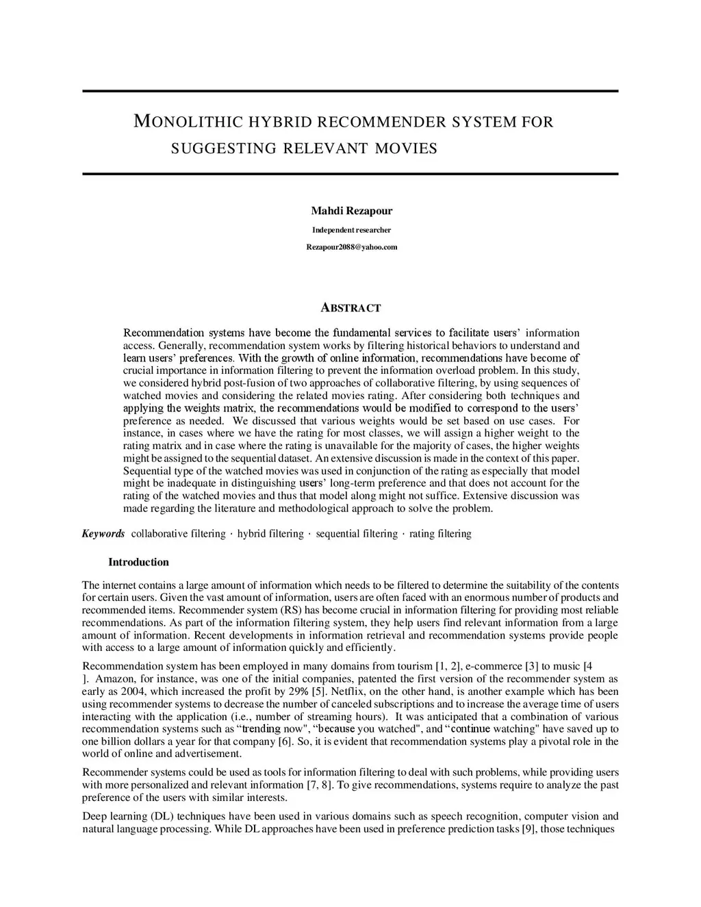 Post-fusion monolithic hybrid recommender system for suggesting relevant movies to users