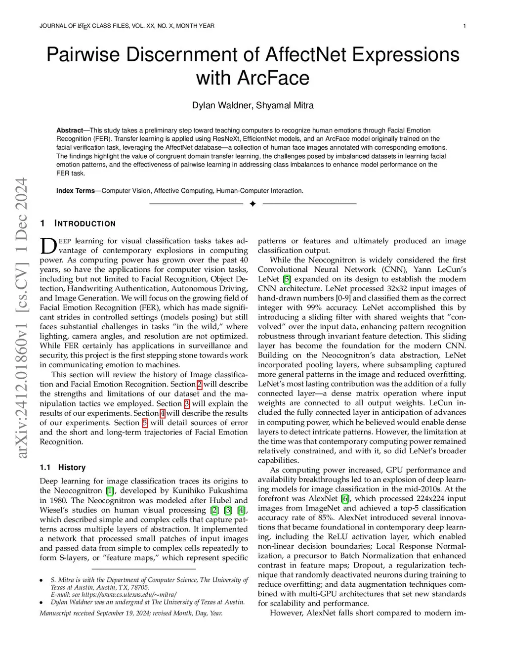 This study takes a preliminary step toward teaching computers to recognize human emotions through Facial Emotion Recognition (FER). Transfer learning is applied using ResNeXt, EfficientNet models, and an ArcFace model originally trained on the facial verification task, leveraging the AffectNet database, a collection of human face images annotated with corresponding emotions. The findings highlight the value of congruent domain transfer learning, the challenges posed by imbalanced datasets in learning facial emotion patterns, and the effectiveness of pairwise learning in addressing class imbalances to enhance model performance on the FER task.