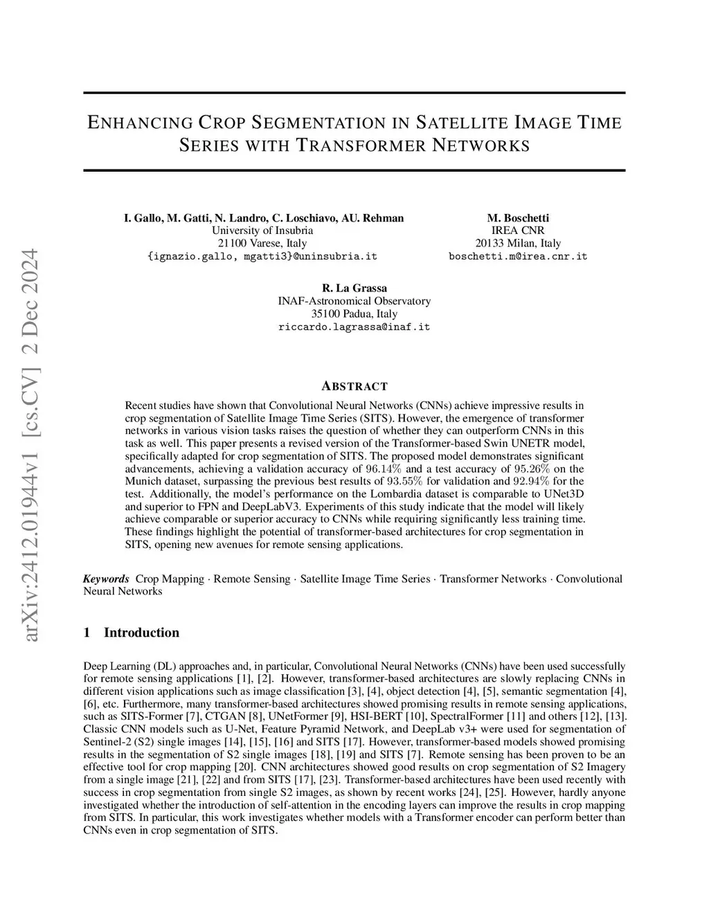 Recent studies have shown that Convolutional Neural Networks (CNNs) achieve impressive results in crop segmentation of Satellite Image Time Series (SITS). However, the emergence of transformer networks in various vision tasks raises the question of whether they can outperform CNNs in this task as well. This paper presents a revised version of the Transformer-based Swin UNETR model, specifically adapted for crop segmentation of SITS. The proposed model demonstrates significant advancements, achieving a validation accuracy of 96.14% and a test accuracy of 95.26% on the Munich dataset, surpassing the previous best results of 93.55% for validation and 92.94% for the test. Additionally, the model's performance on the Lombardia dataset is comparable to UNet3D and superior to FPN and DeepLabV3. Experiments of this study indicate that the model will likely achieve comparable or superior accuracy to CNNs while requiring significantly less training time. These findings highlight the potential of transformer-based architectures for crop segmentation in SITS, opening new avenues for remote sensing applications.