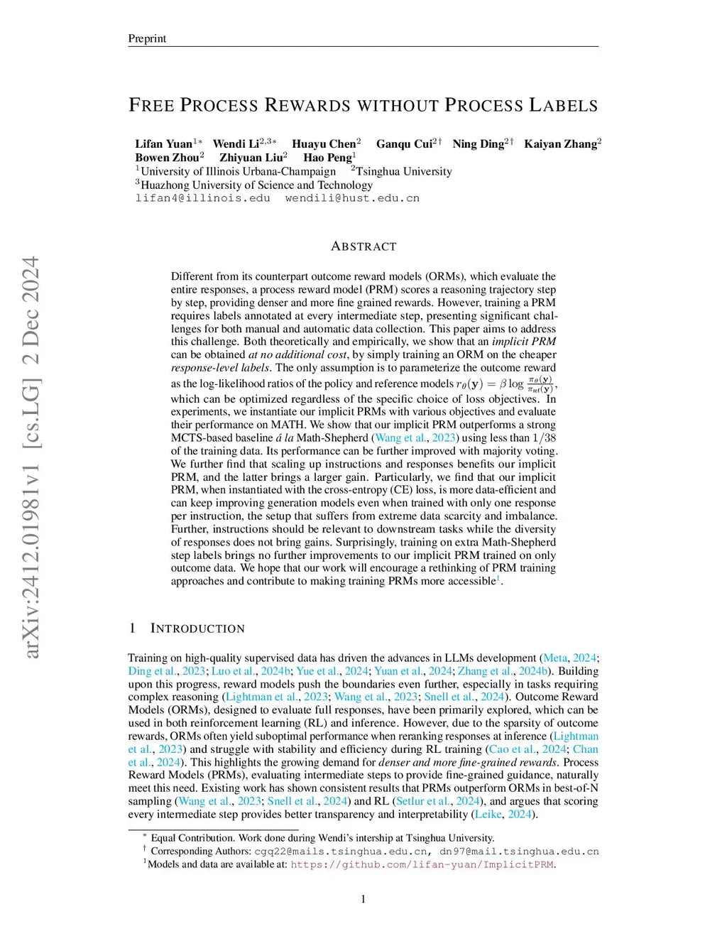 Different from its counterpart outcome reward models (ORMs), which evaluate the entire responses, a process reward model (PRM) scores a reasoning trajectory step by step, providing denser and more fine grained rewards. However, training a PRM requires labels annotated at every intermediate step, presenting significant challenges for both manual and automatic data collection. This paper aims to address this challenge. Both theoretically and empirically, we show that an \textit{implicit PRM} can be obtained at no additional cost, by simply training an ORM on the cheaper response-level labels. The only assumption is to parameterize the outcome reward as the log-likelihood ratios of the policy and reference models, which can be optimized regardless of the specific choice of loss objectives. In experiments, we instantiate our implicit PRMs with various objectives and evaluate their performance on MATH. We show that our implicit PRM outperforms a strong MCTS-based baseline \textit{\á la} Math-Shepherd using less than of the training data. Its performance can be further improved with majority voting. We further find that scaling up instructions and responses benefits our implicit PRM, and the latter brings a larger gain. Particularly, we find that our implicit PRM, when instantiated with the cross-entropy (CE) loss, is more data-efficient and can keep improving generation models even when trained with only one response per instruction, the setup that suffers from extreme data scarcity and imbalance. Further, instructions should be relevant to downstream tasks while the diversity of responses does not bring gains. Surprisingly, training on extra Math-Shepherd step labels brings no further improvements to our implicit PRM trained on only outcome data. We hope that our work will encourage a rethinking of PRM training approaches and contribute to making training PRMs more accessible.