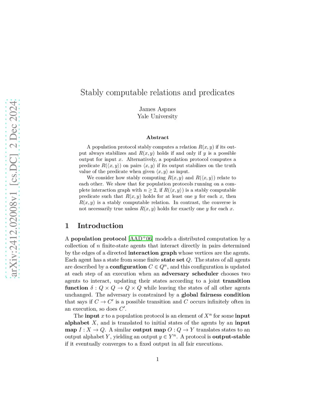 A population protocol stably computes a relation R(x,y) if its output always stabilizes and R(x,y) holds if and only if y is a possible output for input x. Alternatively, a population protocol computes a predicate R(<x,y>) on pairs <x,y> if its output stabilizes on the truth value of the predicate when given <x,y> as input. We consider how stably computing R(x,y) and R(<x,y>) relate to each other. We show that for population protocols running on a complete interaction graph with n>=2, if R(<x,y>) is a stably computable predicate such that R(x,y) holds for at least one y for each x, then R(x,y) is a stably computable relation. In contrast, the converse is not necessarily true unless R(x,y) holds for exactly one y for each x.