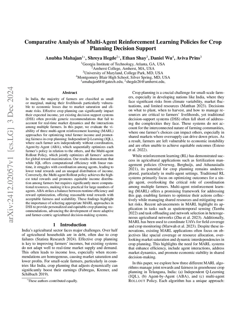 Comparative Analysis of Multi-Agent Reinforcement Learning Policies for Crop Planning Decision Support