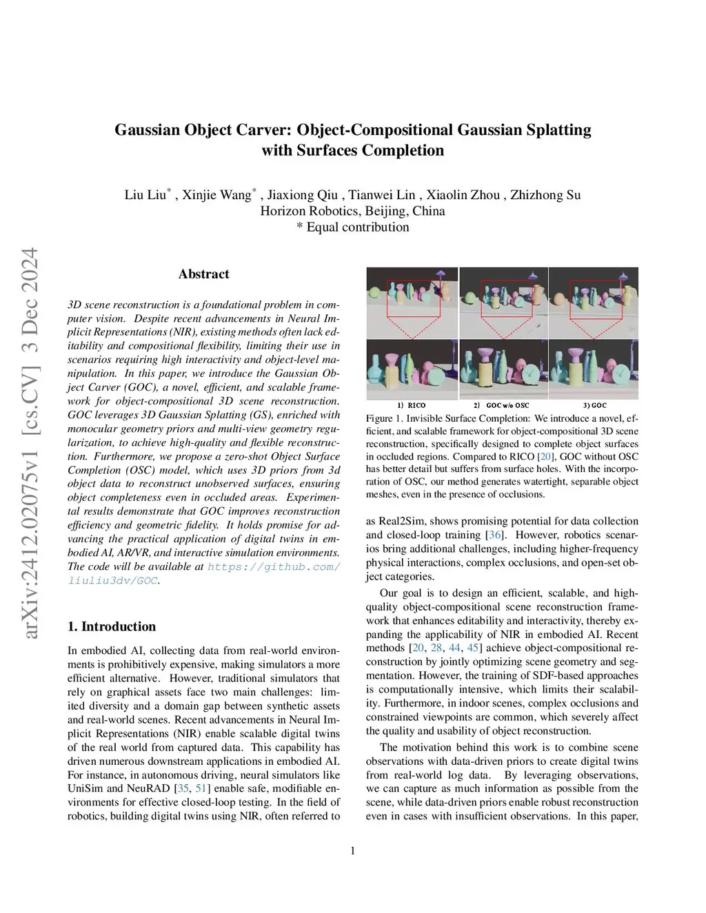 3D scene reconstruction is a foundational problem in computer vision. Despite recent advancements in Neural Implicit Representations (NIR), existing methods often lack editability and compositional flexibility, limiting their use in scenarios requiring high interactivity and object-level manipulation. In this paper, we introduce the Gaussian Object Carver (GOC), a novel, efficient, and scalable framework for object-compositional 3D scene reconstruction. GOC leverages 3D Gaussian Splatting (GS), enriched with monocular geometry priors and multi-view geometry regularization, to achieve high-quality and flexible reconstruction. Furthermore, we propose a zero-shot Object Surface Completion (OSC) model, which uses 3D priors from 3d object data to reconstruct unobserved surfaces, ensuring object completeness even in occluded areas. Experimental results demonstrate that GOC improves reconstruction efficiency and geometric fidelity. It holds promise for advancing the practical application of digital twins in embodied AI, AR/VR, and interactive simulation environments.