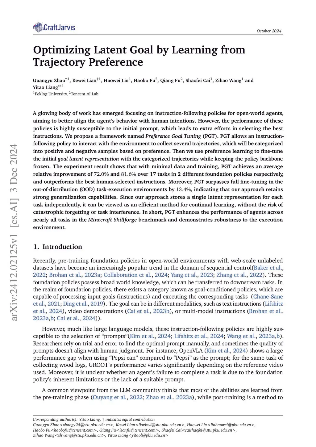 A glowing body of work has emerged focusing on instruction-following policies for open-world agents, aiming to better align the agent's behavior with human intentions. However, the performance of these policies is highly susceptible to the initial prompt, which leads to extra efforts in selecting the best instructions. We propose a framework named Preference Goal Tuning (PGT). PGT allows an instruction following policy to interact with the environment to collect several trajectories, which will be categorized into positive and negative samples based on preference. Then we use preference learning to fine-tune the initial goal latent representation with the categorized trajectories while keeping the policy backbone frozen. The experiment result shows that with minimal data and training, PGT achieves an average relative improvement of 72.0% and 81.6% over 17 tasks in 2 different foundation policies respectively, and outperforms the best human-selected instructions. Moreover, PGT surpasses full fine-tuning in the out-of-distribution (OOD) task-execution environments by 13.4%, indicating that our approach retains strong generalization capabilities. Since our approach stores a single latent representation for each task independently, it can be viewed as an efficient method for continual learning, without the risk of catastrophic forgetting or task interference. In short, PGT enhances the performance of agents across nearly all tasks in the Minecraft Skillforge benchmark and demonstrates robustness to the execution environment.