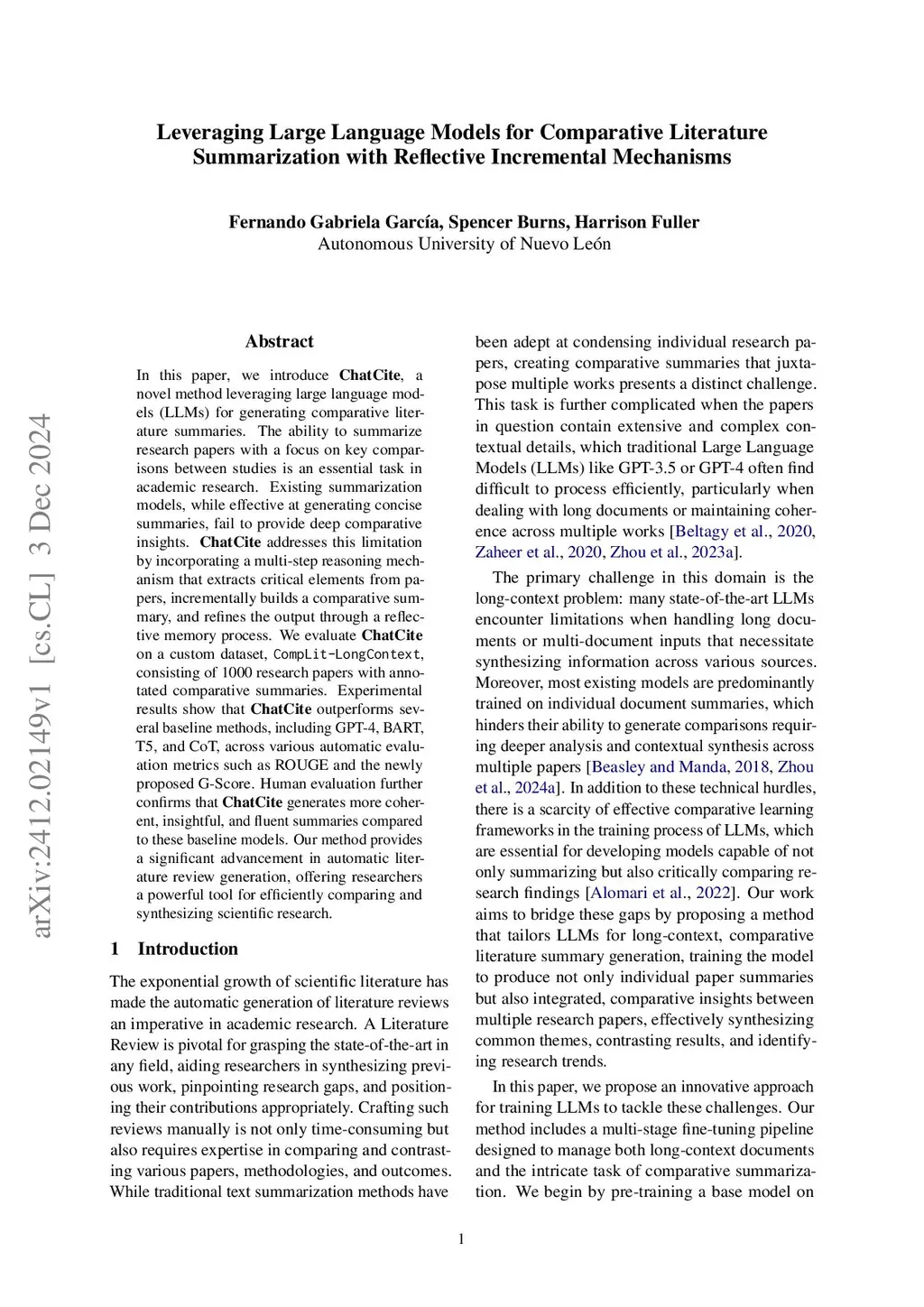 In this paper, we introduce ChatCite, a novel method leveraging large language models (LLMs) for generating comparative literature summaries. The ability to summarize research papers with a focus on key comparisons between studies is an essential task in academic research. Existing summarization models, while effective at generating concise summaries, fail to provide deep comparative insights. ChatCite addresses this limitation by incorporating a multi-step reasoning mechanism that extracts critical elements from papers, incrementally builds a comparative summary, and refines the output through a reflective memory process. We evaluate ChatCite on a custom dataset, CompLit-LongContext, consisting of 1000 research papers with annotated comparative summaries. Experimental results show that ChatCite outperforms several baseline methods, including GPT-4, BART, T5, and CoT, across various automatic evaluation metrics such as ROUGE and the newly proposed G-Score. Human evaluation further confirms that ChatCite generates more coherent, insightful, and fluent summaries compared to these baseline models. Our method provides a significant advancement in automatic literature review generation, offering researchers a powerful tool for efficiently comparing and synthesizing scientific research.