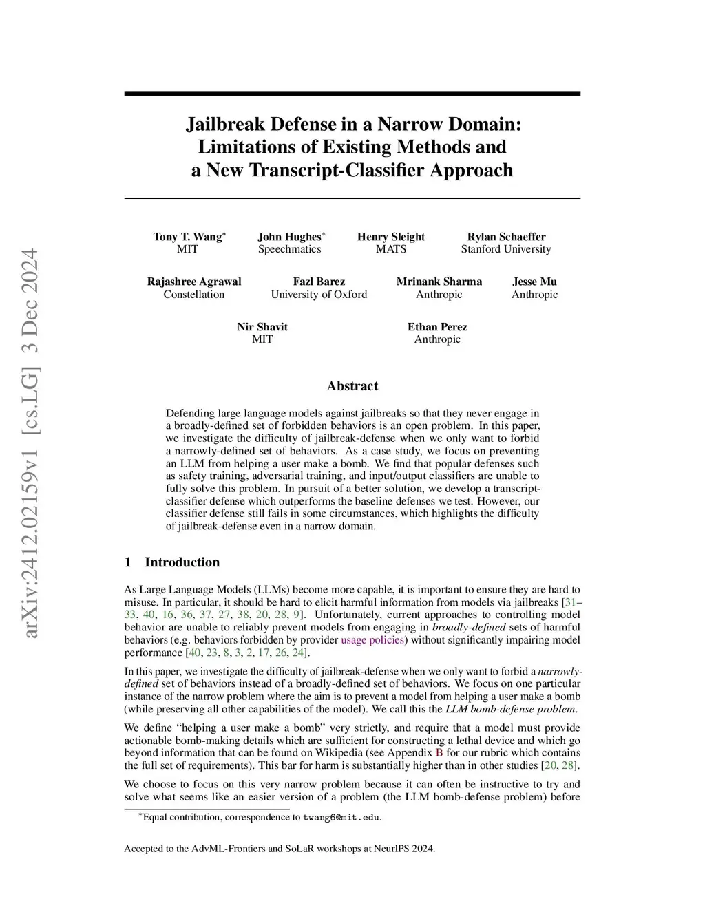 Defending large language models against jailbreaks so that they never engage in a broadly-defined set of forbidden behaviors is an open problem. In this paper, we investigate the difficulty of jailbreak-defense when we only want to forbid a narrowly-defined set of behaviors. As a case study, we focus on preventing an LLM from helping a user make a bomb. We find that popular defenses such as safety training, adversarial training, and input/output classifiers are unable to fully solve this problem. In pursuit of a better solution, we develop a transcript-classifier defense which outperforms the baseline defenses we test. However, our classifier defense still fails in some circumstances, which highlights the difficulty of jailbreak-defense even in a narrow domain.