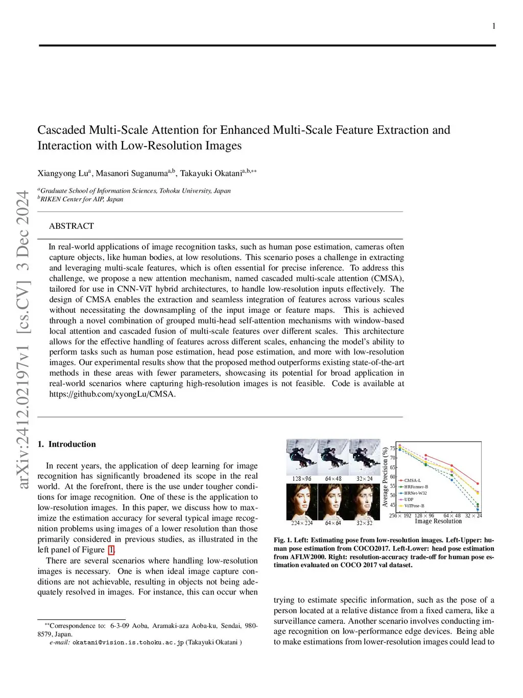 In real-world applications of image recognition tasks, such as human pose estimation, cameras often capture objects, like human bodies, at low resolutions. This scenario poses a challenge in extracting and leveraging multi-scale features, which is often essential for precise inference. To address this challenge, we propose a new attention mechanism, named cascaded multi-scale attention (CMSA), tailored for use in CNN-ViT hybrid architectures, to handle low-resolution inputs effectively. The design of CMSA enables the extraction and seamless integration of features across various scales without necessitating the downsampling of the input image or feature maps. This is achieved through a novel combination of grouped multi-head self-attention mechanisms with window-based local attention and cascaded fusion of multi-scale features over different scales. This architecture allows for the effective handling of features across different scales, enhancing the model's ability to perform tasks such as human pose estimation, head pose estimation, and more with low-resolution images. Our experimental results show that the proposed method outperforms existing state-of-the-art methods in these areas with fewer parameters, showcasing its potential for broad application in real-world scenarios where capturing high-resolution images is not feasible. Code is available atthis https URL.