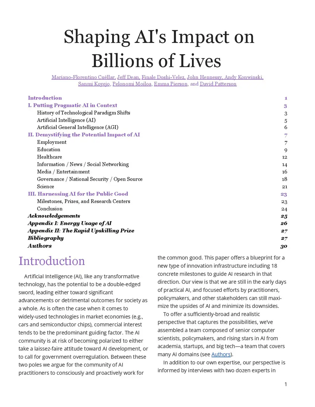 Artificial Intelligence (AI), like any transformative technology, has the potential to be a double-edged sword, leading either toward significant advancements or detrimental outcomes for society as a whole. As is often the case when it comes to widely-used technologies in market economies (e.g., cars and semiconductor chips), commercial interest tends to be the predominant guiding factor. The AI community is at risk of becoming polarized to either take a laissez-faire attitude toward AI development, or to call for government overregulation. Between these two poles we argue for the community of AI practitioners to consciously and proactively work for the common good. This paper offers a blueprint for a new type of innovation infrastructure including 18 concrete milestones to guide AI research in that direction. Our view is that we are still in the early days of practical AI, and focused efforts by practitioners, policymakers, and other stakeholders can still maximize the upsides of AI and minimize its downsides. We talked to luminaries such as recent Nobelist John Jumper on science, President Barack Obama on governance, former UN Ambassador and former National Security Advisor Susan Rice on security, philanthropist Eric Schmidt on several topics, and science fiction novelist Neal Stephenson on entertainment. This ongoing dialogue and collaborative effort has produced a comprehensive, realistic view of what the actual impact of AI could be, from a diverse assembly of thinkers with deep understanding of this technology and these domains. From these exchanges, five recurring guidelines emerged, which form the cornerstone of a framework for beginning to harness AI in service of the public good. They not only guide our efforts in discovery but also shape our approach to deploying this transformative technology responsibly and ethically.