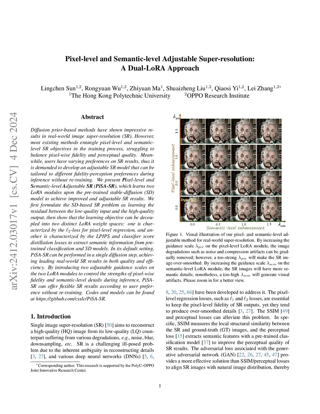 Diffusion prior-based methods have shown impressive results in real-world image super-resolution (SR). However, most existing methods entangle pixel-level and semantic-level SR objectives in the training process, struggling to balance pixel-wise fidelity and perceptual quality. Meanwhile, users have varying preferences on SR results, thus it is demanded to develop an adjustable SR model that can be tailored to different fidelity-perception preferences during inference without re-training. We present Pixel-level and Semantic-level Adjustable SR (PiSA-SR), which learns two LoRA modules upon the pre-trained stable-diffusion (SD) model to achieve improved and adjustable SR results. We first formulate the SD-based SR problem as learning the residual between the low-quality input and the high-quality output, then show that the learning objective can be decoupled into two distinct LoRA weight spaces: one is characterized by the -loss for pixel-level regression, and another is characterized by the LPIPS and classifier score distillation losses to extract semantic information from pre-trained classification and SD models. In its default setting, PiSA-SR can be performed in a single diffusion step, achieving leading real-world SR results in both quality and efficiency. By introducing two adjustable guidance scales on the two LoRA modules to control the strengths of pixel-wise fidelity and semantic-level details during inference, PiSASR can offer flexible SR results according to user preference without re-training. Codes and models can be found atthis https URL.