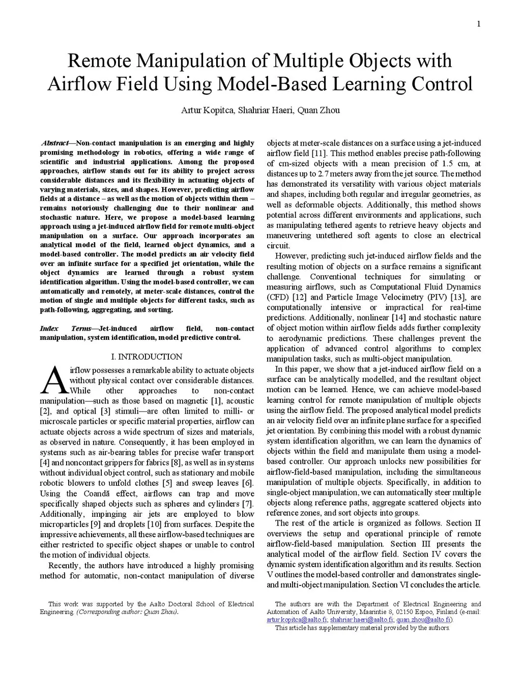 Non-contact manipulation is a promising methodology in robotics, offering a wide range of scientific and industrial applications. Among the proposed approaches, airflow stands out for its ability to project across considerable distances and its flexibility in actuating objects of varying materials, sizes, and shapes. However, predicting airflow fields at a distance-and the motion of objects within them-remains notoriously challenging due to their nonlinear and stochastic nature. Here, we propose a model-based learning approach using a jet-induced airflow field for remote multi-object manipulation on a surface. Our approach incorporates an analytical model of the field, learned object dynamics, and a model-based controller. The model predicts an air velocity field over an infinite surface for a specified jet orientation, while the object dynamics are learned through a robust system identification algorithm. Using the model-based controller, we can automatically and remotely, at meter-scale distances, control the motion of single and multiple objects for different tasks, such as path-following, aggregating, and sorting.