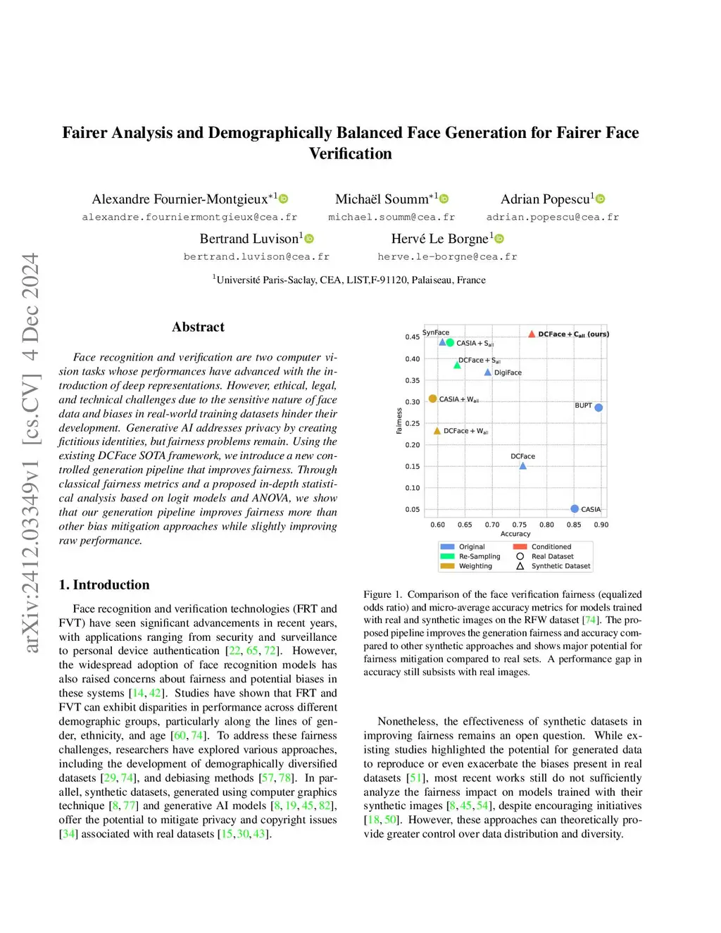 Face recognition and verification are two computer vision tasks whose performances have advanced with the introduction of deep representations. However, ethical, legal, and technical challenges due to the sensitive nature of face data and biases in real-world training datasets hinder their development. Generative AI addresses privacy by creating fictitious identities, but fairness problems remain. Using the existing DCFace SOTA framework, we introduce a new controlled generation pipeline that improves fairness. Through classical fairness metrics and a proposed in-depth statistical analysis based on logit models and ANOVA, we show that our generation pipeline improves fairness more than other bias mitigation approaches while slightly improving raw performance.