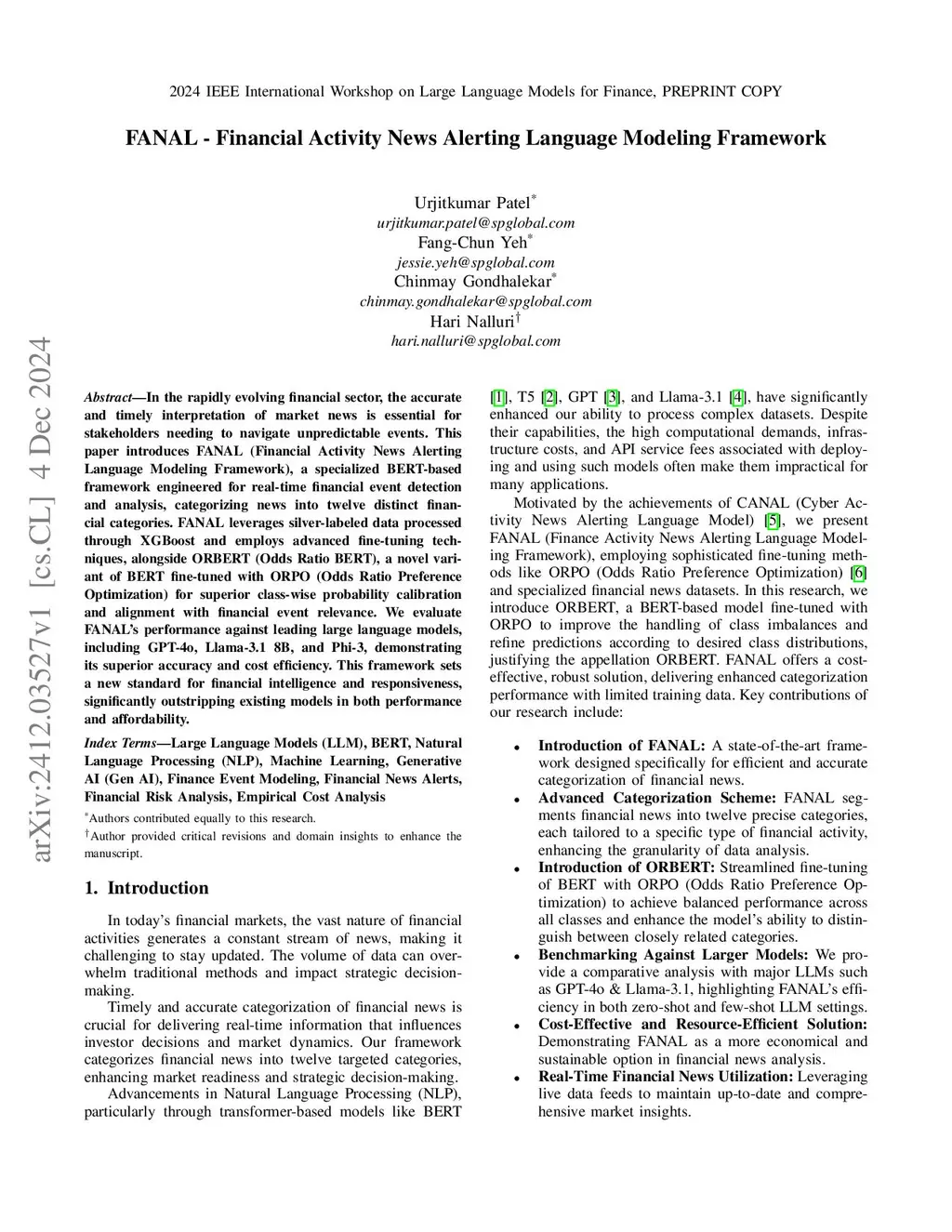 In the rapidly evolving financial sector, the accurate and timely interpretation of market news is essential for stakeholders needing to navigate unpredictable events. This paper introduces FANAL (Financial Activity News Alerting Language Modeling Framework), a specialized BERT-based framework engineered for real-time financial event detection and analysis, categorizing news into twelve distinct financial categories. FANAL leverages silver-labeled data processed through XGBoost and employs advanced fine-tuning techniques, alongside ORBERT (Odds Ratio BERT), a novel variant of BERT fine-tuned with ORPO (Odds Ratio Preference Optimization) for superior class-wise probability calibration and alignment with financial event relevance. We evaluate FANAL's performance against leading large language models, including GPT-4o, Llama-3.1 8B, and Phi-3, demonstrating its superior accuracy and cost efficiency. This framework sets a new standard for financial intelligence and responsiveness, significantly outstripping existing models in both performance and affordability.