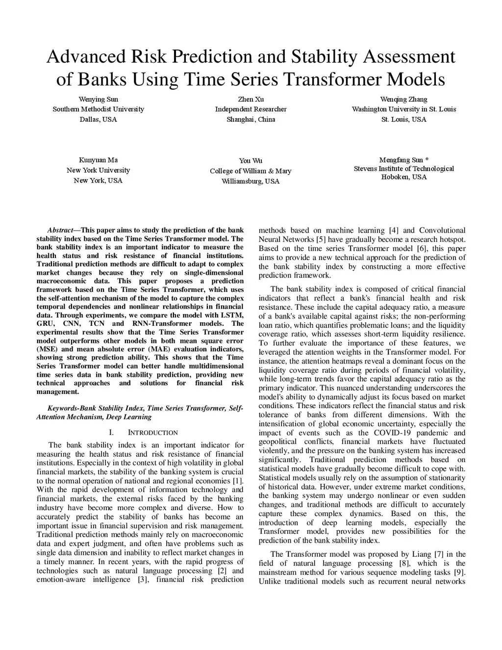 This paper aims to study the prediction of the bank stability index based on the Time Series Transformer model. The bank stability index is an important indicator to measure the health status and risk resistance of financial institutions. Traditional prediction methods are difficult to adapt to complex market changes because they rely on single-dimensional macroeconomic data. This paper proposes a prediction framework based on the Time Series Transformer, which uses the self-attention mechanism of the model to capture the complex temporal dependencies and nonlinear relationships in financial data. Through experiments, we compare the model with LSTM, GRU, CNN, TCN and RNN-Transformer models. The experimental results show that the Time Series Transformer model outperforms other models in both mean square error (MSE) and mean absolute error (MAE) evaluation indicators, showing strong prediction ability. This shows that the Time Series Transformer model can better handle multidimensional time series data in bank stability prediction, providing new technical approaches and solutions for financial risk management.