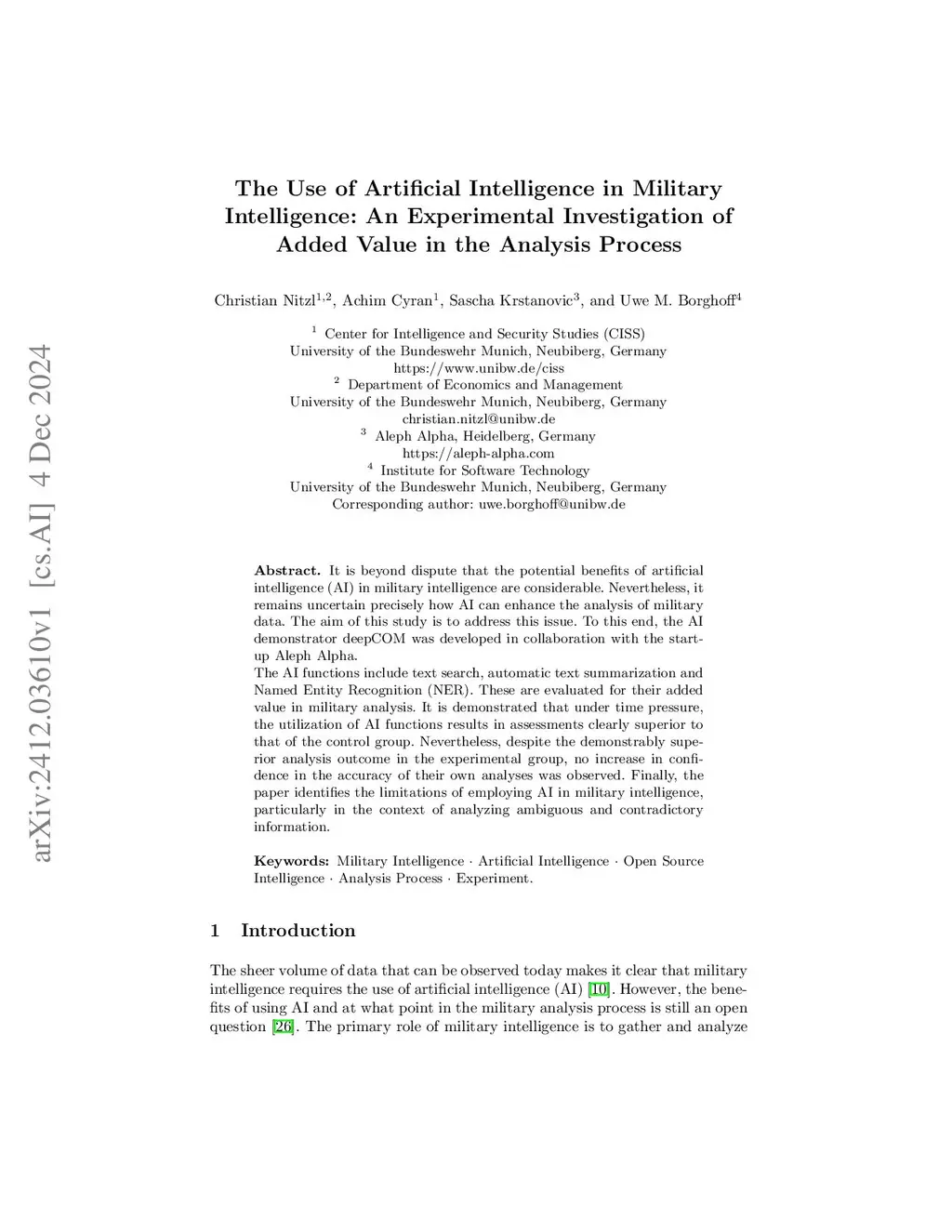 It is beyond dispute that the potential benefits of artificial intelligence (AI) in military intelligence are considerable. Nevertheless, it remains uncertain precisely how AI can enhance the analysis of military data. The aim of this study is to address this issue. To this end, the AI demonstrator deepCOM was developed in collaboration with the start-up Aleph Alpha. The AI functions include text search, automatic text summarization and Named Entity Recognition (NER). These are evaluated for their added value in military analysis. It is demonstrated that under time pressure, the utilization of AI functions results in assessments clearly superior to that of the control group. Nevertheless, despite the demonstrably superior analysis outcome in the experimental group, no increase in confidence in the accuracy of their own analyses was observed. Finally, the paper identifies the limitations of employing AI in military intelligence, particularly in the context of analyzing ambiguous and contradictory information.