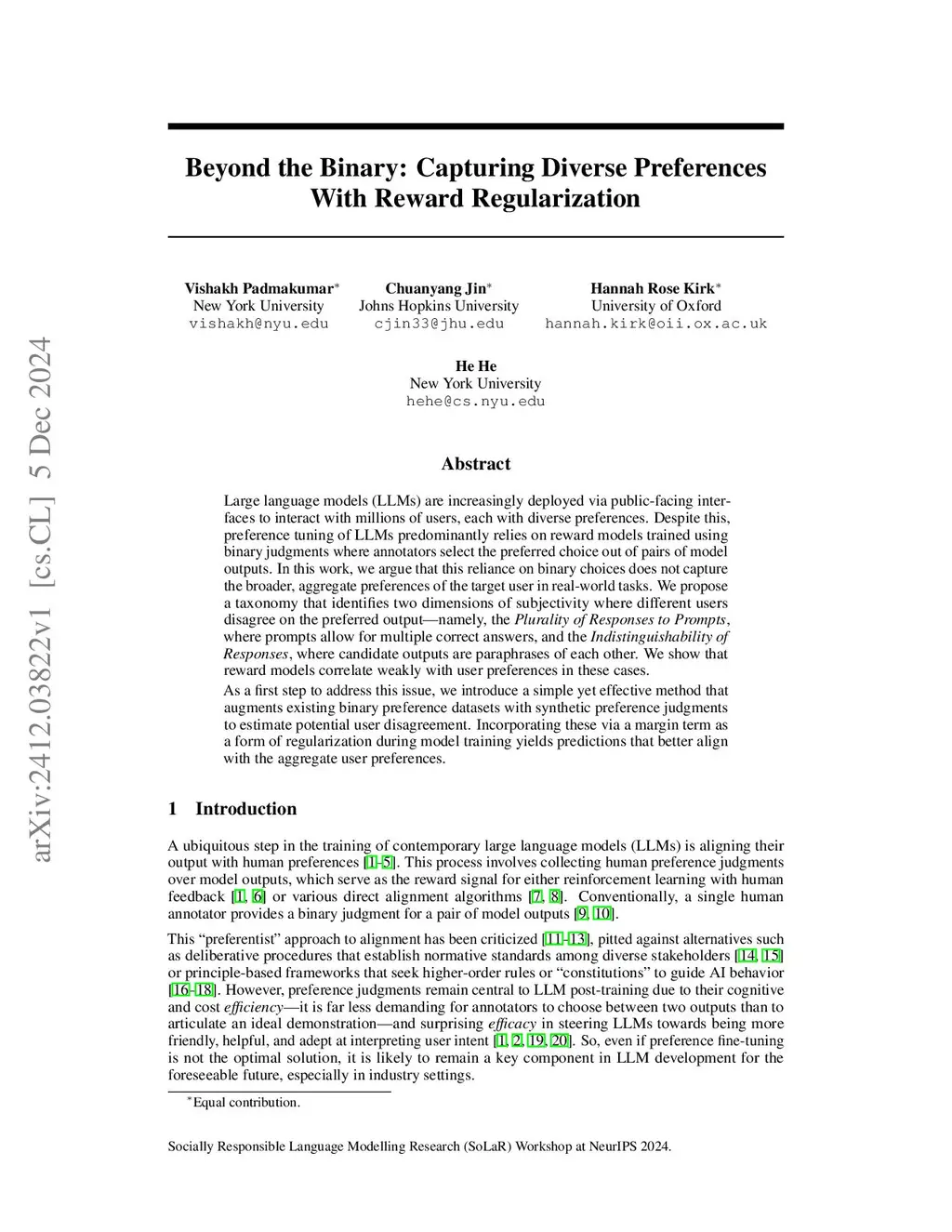 Large language models (LLMs) are increasingly deployed via public-facing interfaces to interact with millions of users, each with diverse preferences. Despite this, preference tuning of LLMs predominantly relies on reward models trained using binary judgments where annotators select the preferred choice out of pairs of model outputs. In this work, we argue that this reliance on binary choices does not capture the broader, aggregate preferences of the target user in real-world tasks. We propose a taxonomy that identifies two dimensions of subjectivity where different users disagree on the preferred output-namely, the Plurality of Responses to Prompts, where prompts allow for multiple correct answers, and the Indistinguishability of Responses, where candidate outputs are paraphrases of each other. We show that reward models correlate weakly with user preferences in these cases. As a first step to address this issue, we introduce a simple yet effective method that augments existing binary preference datasets with synthetic preference judgments to estimate potential user disagreement. Incorporating these via a margin term as a form of regularization during model training yields predictions that better align with the aggregate user preferences.