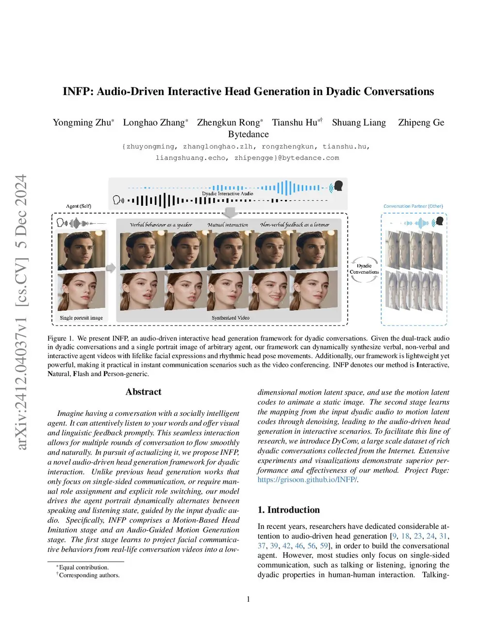 Imagine having a conversation with a socially intelligent agent. It can attentively listen to your words and offer visual and linguistic feedback promptly. This seamless interaction allows for multiple rounds of conversation to flow smoothly and naturally. In pursuit of actualizing it, we propose INFP, a novel audio-driven head generation framework for dyadic interaction. Unlike previous head generation works that only focus on single-sided communication, or require manual role assignment and explicit role switching, our model drives the agent portrait dynamically alternates between speaking and listening state, guided by the input dyadic audio. Specifically, INFP comprises a Motion-Based Head Imitation stage and an Audio-Guided Motion Generation stage. The first stage learns to project facial communicative behaviors from real-life conversation videos into a low-dimensional motion latent space, and use the motion latent codes to animate a static image. The second stage learns the mapping from the input dyadic audio to motion latent codes through denoising, leading to the audio-driven head generation in interactive scenarios. To facilitate this line of research, we introduce DyConv, a large scale dataset of rich dyadic conversations collected from the Internet. Extensive experiments and visualizations demonstrate superior performance and effectiveness of our method. Project Page: https://grisoon.github.io/INFP/.
