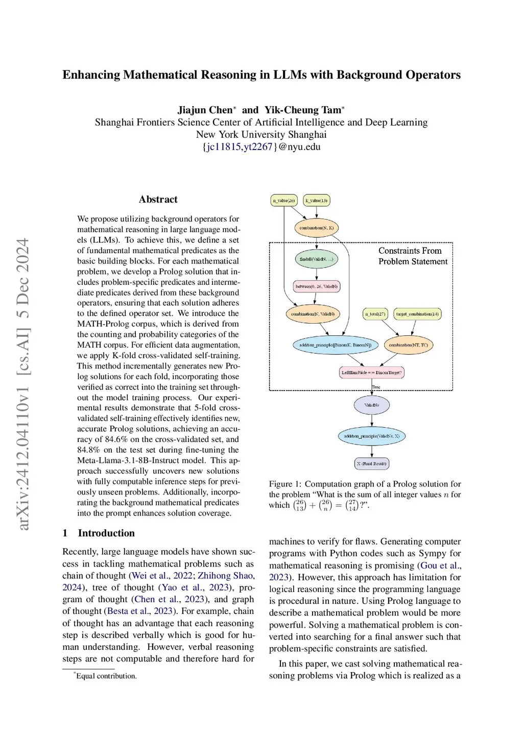 We propose utilizing background operators for mathematical reasoning in large language models (LLMs). To achieve this, we define a set of fundamental mathematical predicates as the basic building blocks. For each mathematical problem, we develop a Prolog solution that includes problem-specific predicates and intermediate predicates derived from these background operators, ensuring that each solution adheres to the defined operator set. We introduce the MATH-Prolog corpus, which is derived from the counting and probability categories of the MATH corpus. For efficient data augmentation, we apply K-fold cross-validated self-training. This method incrementally generates new Prolog solutions for each fold, incorporating those verified as correct into the training set throughout the model training process. Our experimental results demonstrate that 5-fold crossvalidated self-training effectively identifies new, accurate Prolog solutions, achieving an accuracy of 84.6% on the cross-validated set, and 84.8% on the test set during fine-tuning the Meta-Llama-3.1-8B-Instruct model. This approach successfully uncovers new solutions with fully computable inference steps for previously unseen problems. Additionally, incorporating the background mathematical predicates into the prompt enhances solution coverage.