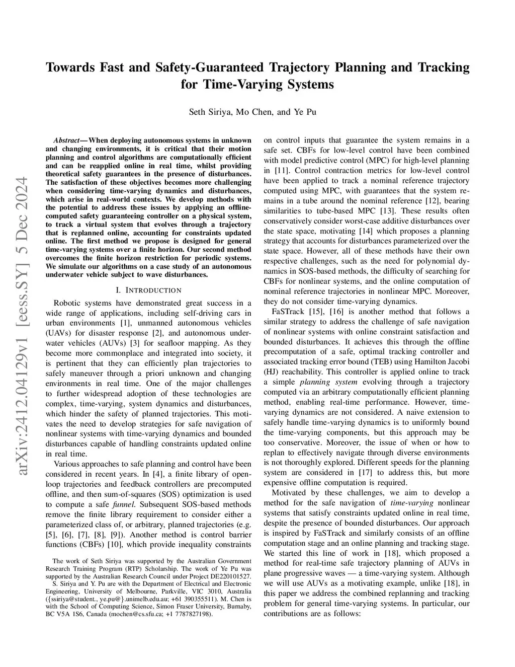 When deploying autonomous systems in unknown and changing environments, it is critical that their motion planning and control algorithms are computationally efficient and can be reapplied online in real time, whilst providing theoretical safety guarantees in the presence of disturbances. The satisfaction of these objectives becomes more challenging when considering time-varying dynamics and disturbances, which arise in real-world contexts. We develop methods with the potential to address these issues by applying an offline-computed safety guaranteeing controller on a physical system, to track a virtual system that evolves through a trajectory that is replanned online, accounting for constraints updated online. The first method we propose is designed for general time-varying systems over a finite horizon. Our second method overcomes the finite horizon restriction for periodic systems. We simulate our algorithms on a case study of an autonomous underwater vehicle subject to wave disturbances.