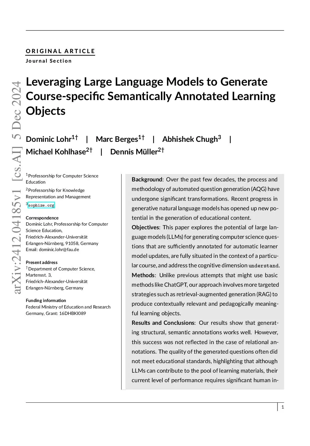 Background: Over the past few decades, the process and methodology of automated question generation (AQG) have undergone significant transformations. Recent progress in generative natural language models has opened up new potential in the generation of educational content. Objectives: This paper explores the potential of large language models (LLMs) for generating computer science questions that are sufficiently annotated for automatic learner model updates, are fully situated in the context of a particular course, and address the cognitive dimension understand. Methods: Unlike previous attempts that might use basic methods like ChatGPT, our approach involves more targeted strategies such as retrieval-augmented generation (RAG) to produce contextually relevant and pedagogically meaningful learning objects. Results and Conclusions: Our results show that generating structural, semantic annotations works well. However, this success was not reflected in the case of relational annotations. The quality of the generated questions often did not meet educational standards, highlighting that although LLMs can contribute to the pool of learning materials, their current level of performance requires significant human intervention to refine and validate the generated content.