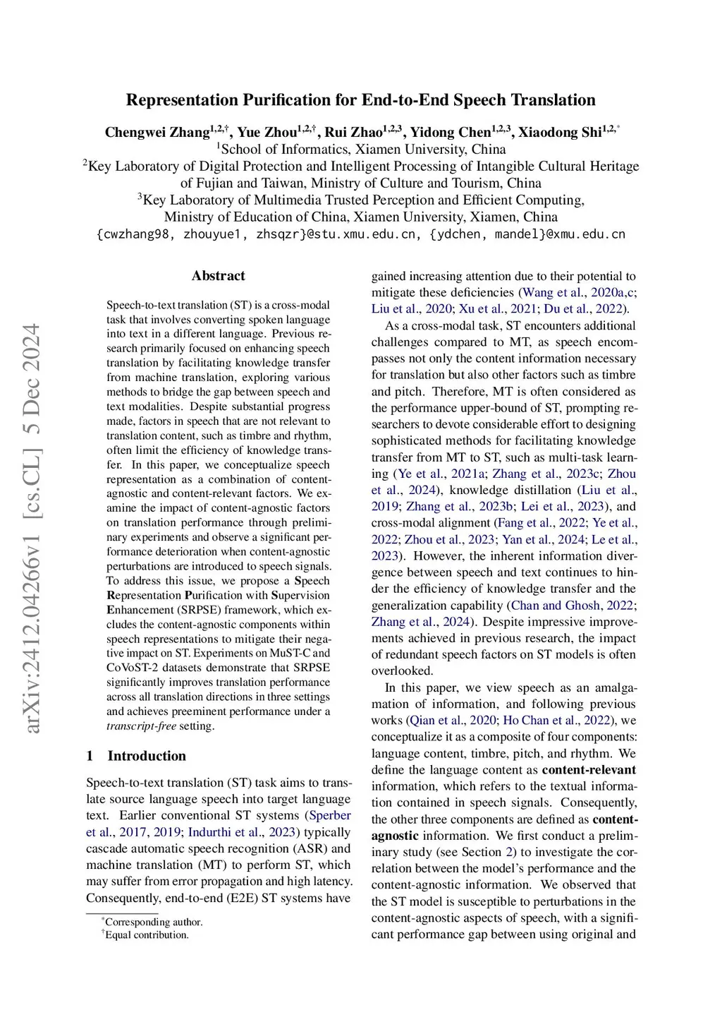 Speech-to-text translation (ST) is a cross-modal task that involves converting spoken language into text in a different language. Previous research primarily focused on enhancing speech translation by facilitating knowledge transfer from machine translation, exploring various methods to bridge the gap between speech and text modalities. Despite substantial progress made, factors in speech that are not relevant to translation content, such as timbre and rhythm, often limit the efficiency of knowledge transfer. In this paper, we conceptualize speech representation as a combination of content-agnostic and content-relevant factors. We examine the impact of content-agnostic factors on translation performance through preliminary experiments and observe a significant performance deterioration when content-agnostic perturbations are introduced to speech signals. To address this issue, we propose a \textbf{S}peech \textbf{R}epresentation \textbf{P}urification with \textbf{S}upervision \textbf{E}nhancement (SRPSE) framework, which excludes the content-agnostic components within speech representations to mitigate their negative impact on ST. Experiments on MuST-C and CoVoST-2 datasets demonstrate that SRPSE significantly improves translation performance across all translation directions in three settings and achieves preeminent performance under a \textit{transcript-free} setting.