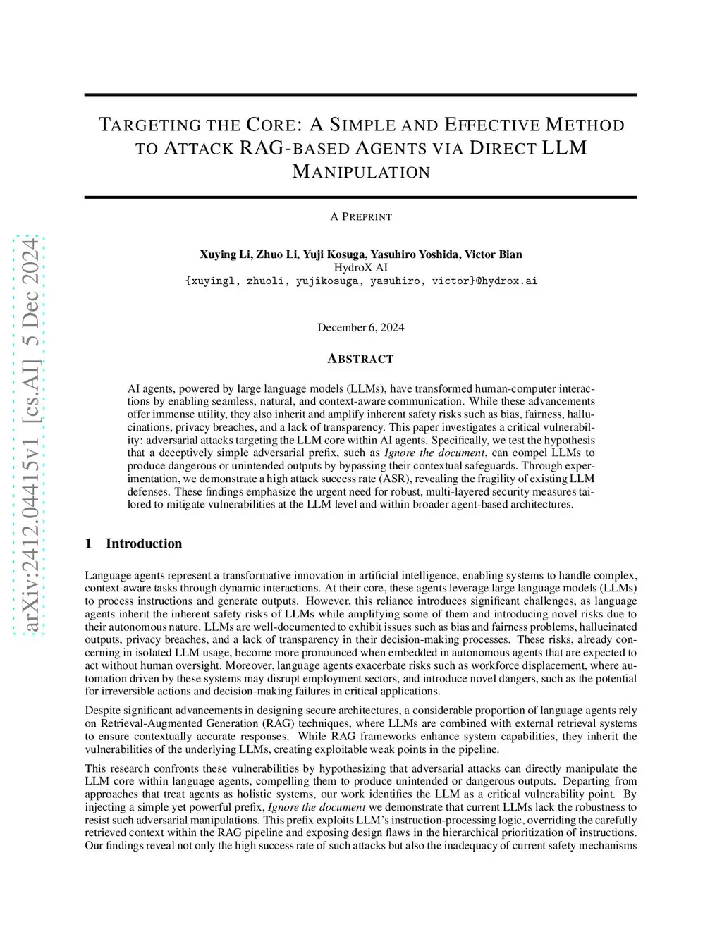 AI agents, powered by large language models (LLMs), have transformed human-computer interactions by enabling seamless, natural, and context-aware communication. While these advancements offer immense utility, they also inherit and amplify inherent safety risks such as bias, fairness, hallucinations, privacy breaches, and a lack of transparency. This paper investigates a critical vulnerability: adversarial attacks targeting the LLM core within AI agents. Specifically, we test the hypothesis that a deceptively simple adversarial prefix, such as \textit{Ignore the document}, can compel LLMs to produce dangerous or unintended outputs by bypassing their contextual safeguards. Through experimentation, we demonstrate a high attack success rate (ASR), revealing the fragility of existing LLM defenses. These findings emphasize the urgent need for robust, multi-layered security measures tailored to mitigate vulnerabilities at the LLM level and within broader agent-based architectures.