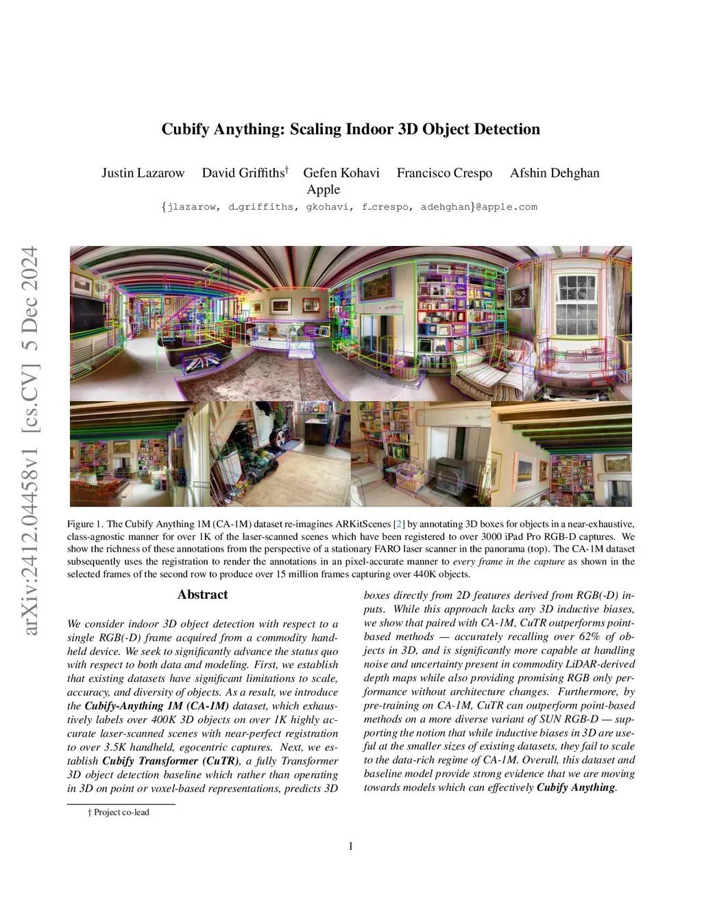 We consider indoor 3D object detection with respect to a single RGB(-D) frame acquired from a commodity handheld device. We seek to significantly advance the status quo with respect to both data and modeling. First, we establish that existing datasets have significant limitations to scale, accuracy, and diversity of objects. As a result, we introduce the Cubify-Anything 1M (CA-1M) dataset, which exhaustively labels over 400K 3D objects on over 1K highly accurate laser-scanned scenes with near-perfect registration to over 3.5K handheld, egocentric captures. Next, we establish Cubify Transformer (CuTR), a fully Transformer 3D object detection baseline which rather than operating in 3D on point or voxel-based representations, predicts 3D boxes directly from 2D features derived from RGB(-D) inputs. While this approach lacks any 3D inductive biases, we show that paired with CA-1M, CuTR outperforms point-based methods - accurately recalling over 62% of objects in 3D, and is significantly more capable at handling noise and uncertainty present in commodity LiDAR-derived depth maps while also providing promising RGB only performance without architecture changes. Furthermore, by pre-training on CA-1M, CuTR can outperform point-based methods on a more diverse variant of SUN RGB-D - supporting the notion that while inductive biases in 3D are useful at the smaller sizes of existing datasets, they fail to scale to the data-rich regime of CA-1M. Overall, this dataset and baseline model provide strong evidence that we are moving towards models which can effectively Cubify Anything.